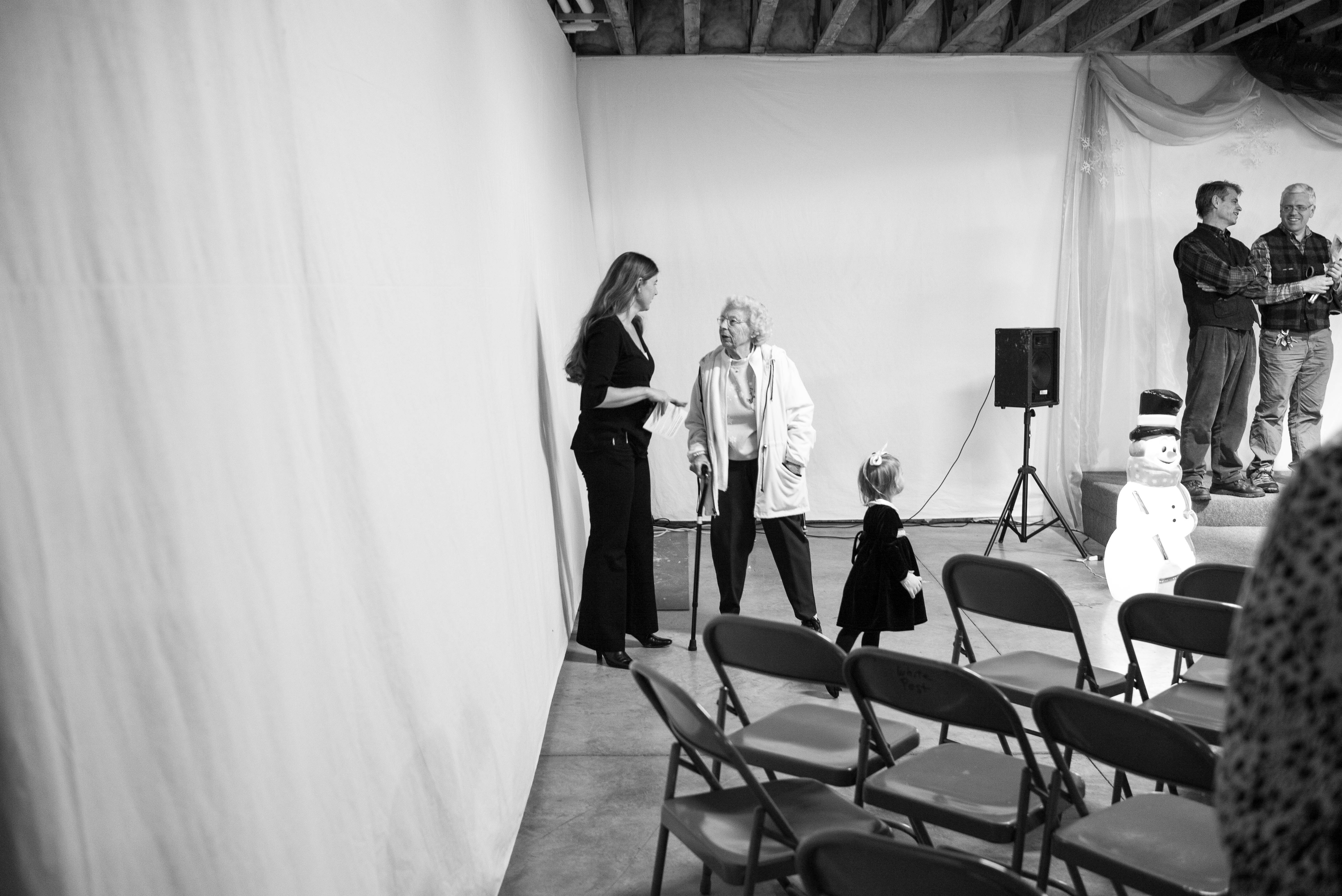 In this intimate black-and-white scene, two women converse in a spacious, softly lit room, framed by a backdrop of blank white fabric. The mood is warm and reflective, punctuated by the distant presence of a snowman and a small child, hinting at a festive gathering. Simple folding chairs line the foreground, emphasizing the casual yet inviting atmosphere of the moment.