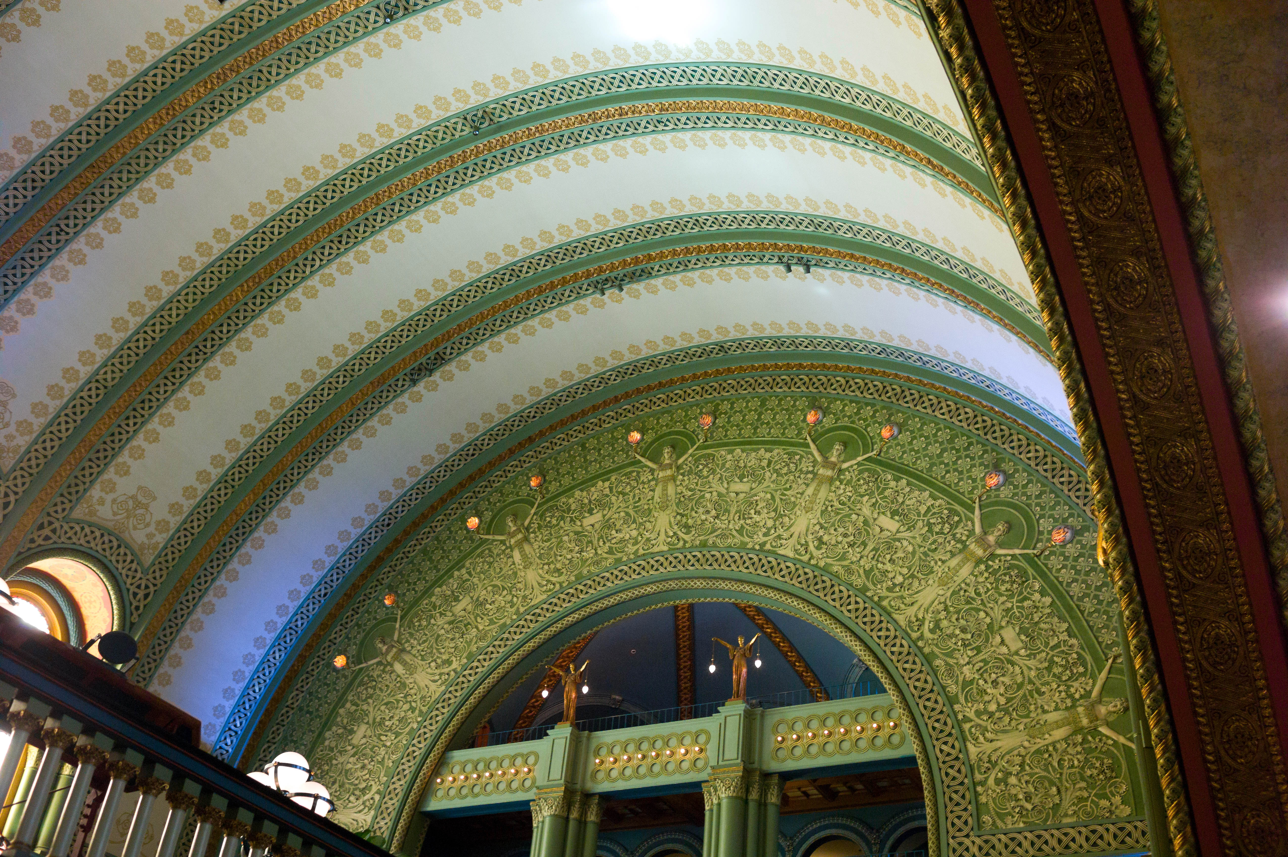 The photograph captures the breathtaking ceiling of a grand architectural space, featuring sweeping arches adorned with intricate green and gold patterns. Soft lighting accentuates the details, creating a tranquil and inviting atmosphere that draws the viewer's gaze upward. The composition emphasizes the grandeur and artistry of the design, evoking a sense of historical richness and elegance.