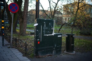This photograph captures an unembellished corner of a city park, featuring a neglected green utility box and a modern trash can, juxtaposed against a backdrop of autumn foliage. The soft, golden hour light filters through the trees, creating a serene yet melancholic atmosphere that hints at forgotten stories. The stark contrast between the man-made structures and the natural environment evokes a sense of urban isolation.