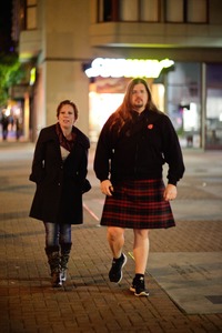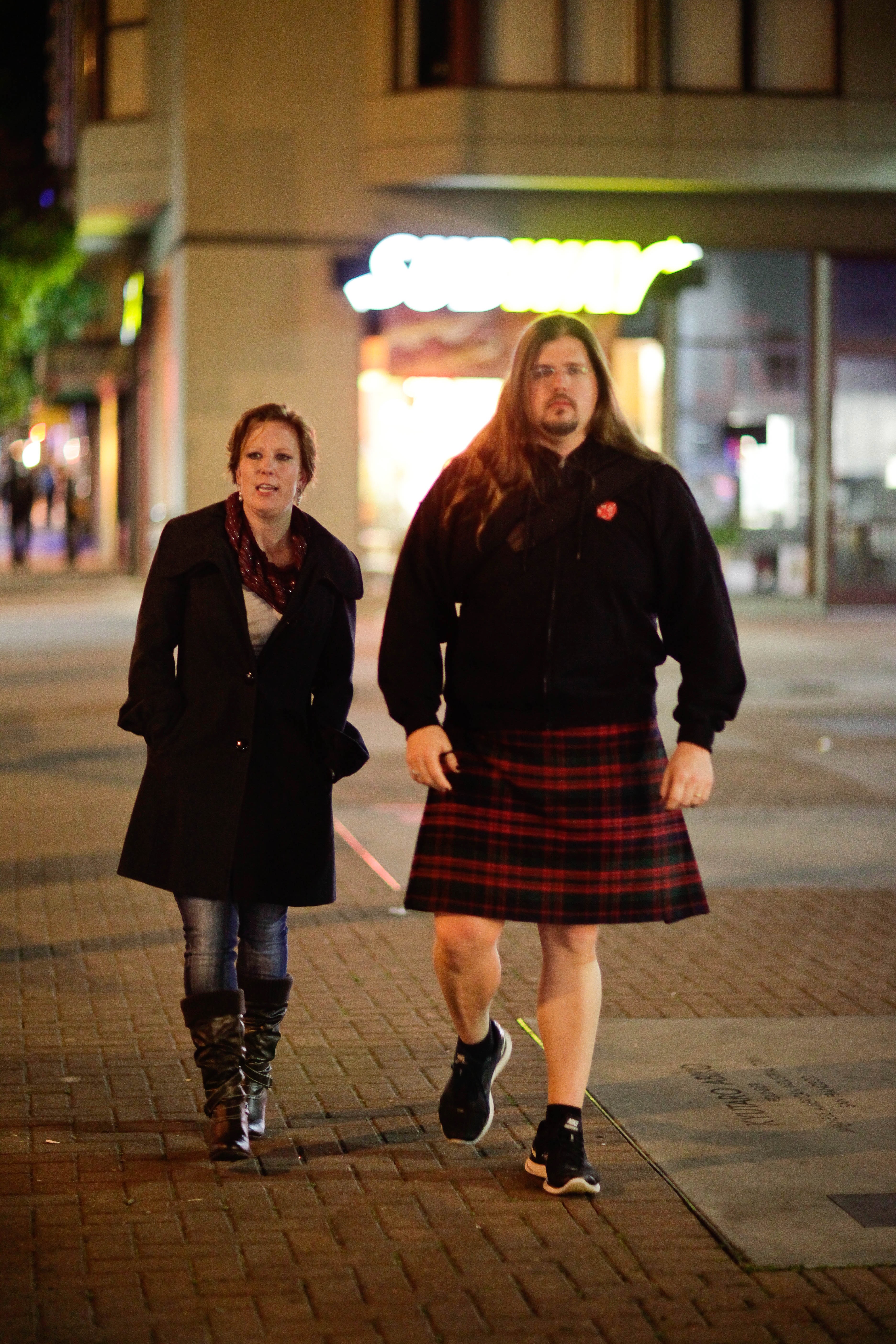 A man in a plaid kilt walks confidently beside a woman dressed in dark attire, both captured in a softly illuminated urban setting. The night casts a relaxed yet intriguing atmosphere, highlighting the unique juxtaposition of their styles. Their expressions suggest a mixture of casual camaraderie and curiosity, drawing the viewer into their late-night adventure.