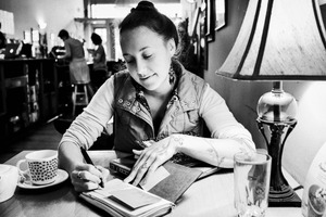 In a cozy café, a young woman is deeply immersed in writing, captured in a moment of creativity and contemplation. The soft, warm lighting from a nearby lamp casts gentle shadows, enhancing the intimate atmosphere, while the black-and-white tones evoke a timeless quality. Her expressive tattoos and focused demeanor reveal a narrative of individuality and inspiration within a bustling environment.