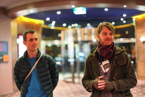Two men stand in a warmly lit lobby, their expressions reflecting a moment of quiet reflection or casual conversation. The soft glow of ambient light contrasts with the vibrant carpet beneath, creating an inviting atmosphere amidst the blurred background of a bustling entrance.