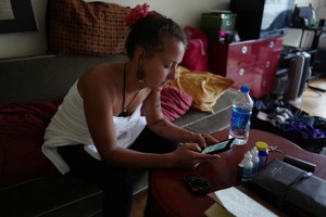 The photograph captures a young woman in casual repose, wrapped in a towel as she engrosses herself in her phone. The warm, soft light filtering through the room casts gentle shadows, enhancing the cozy yet cluttered atmosphere. Elements like the water bottle and personal items scattered around hint at a lived-in, relaxed environment, creating an intimate snapshot of everyday life.