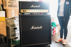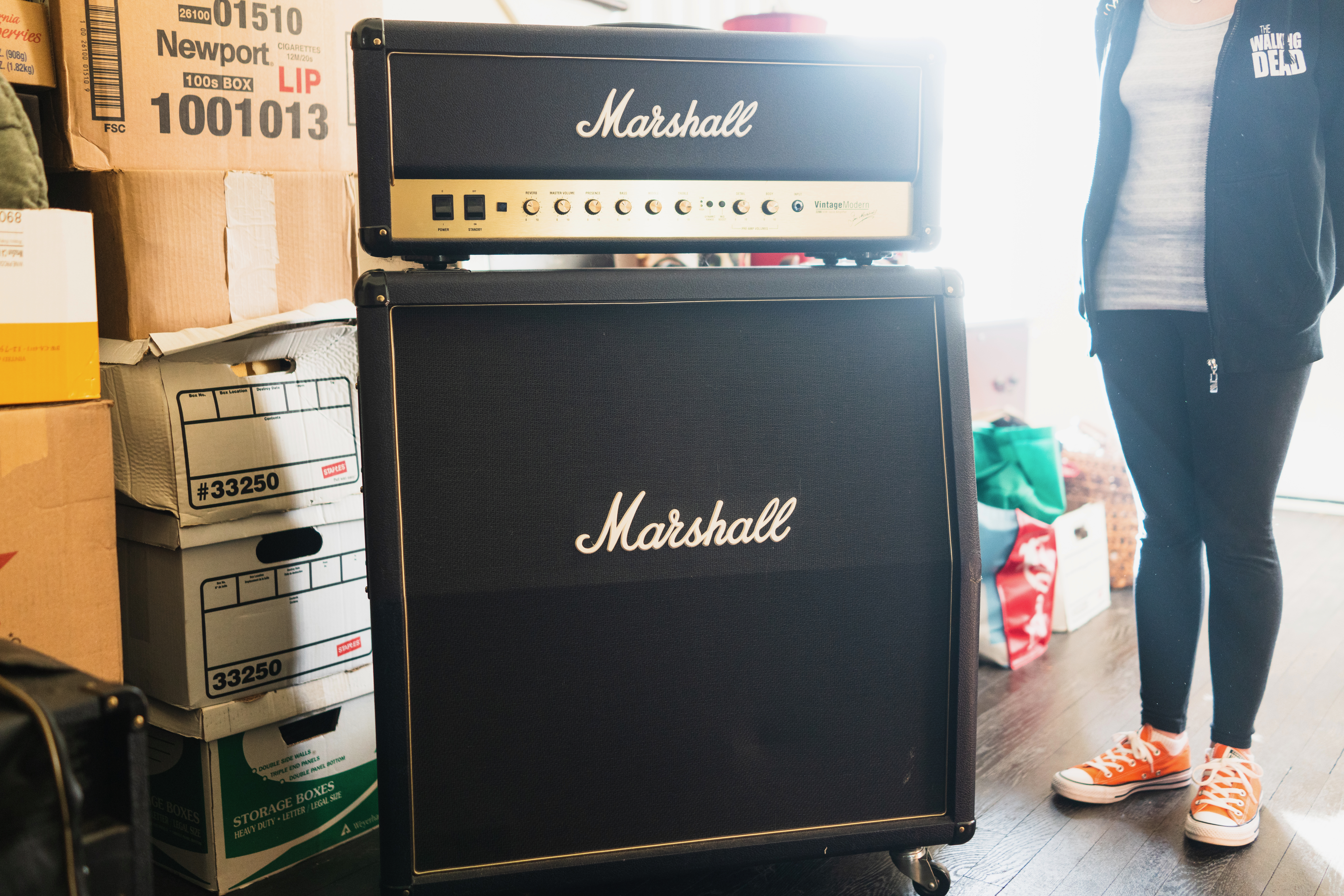 This photograph features a pair of iconic Marshall amplifiers, emphasizing a vibrant blend of music culture and personal space. The warm lighting illuminates the amplifiers, creating a sense of nostalgia and enthusiasm, while contrasting against the casual setting filled with packed boxes and a figure in stylish footwear. The mood is energetic yet relaxed, embodying the spirit of creative expression within a cluttered yet inviting environment.