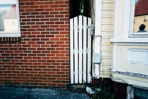 A narrow, weathered white gate stands between two contrasting brick walls, inviting curiosity and contemplation. The warm light illuminates the scene, highlighting the textures of the bricks and the peeling paint of the gate. This tight composition evokes a sense of mystery, suggesting hidden spaces beyond the visible.