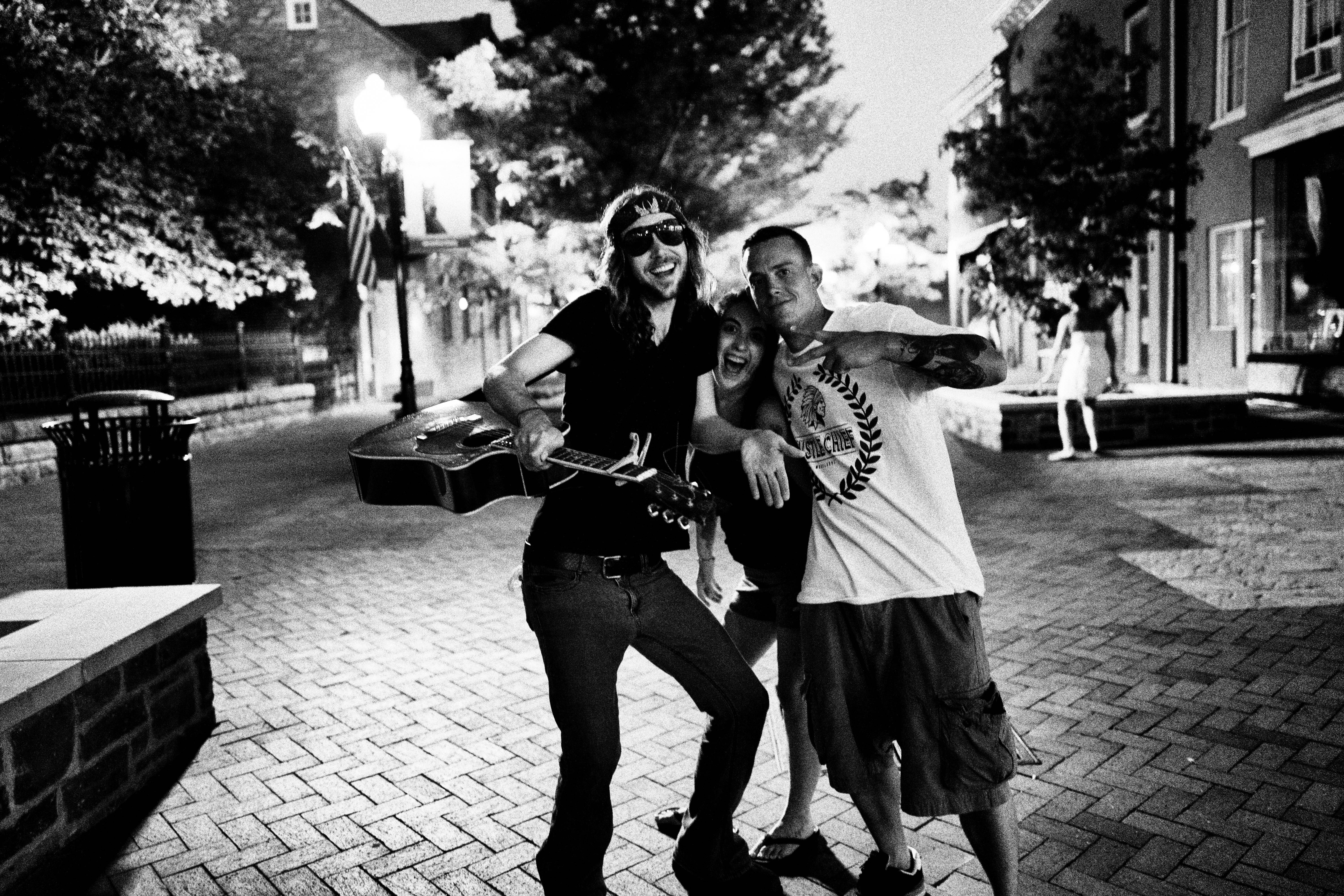 The photograph captures a group of three friends exuding joy and camaraderie in a dimly lit street, highlighting a spontaneous moment during a night out. The musician with his guitar takes center stage, surrounded by laughter and playful poses, emphasizing the carefree energy of the scene. The black-and-white composition enhances the nostalgic feel, drawing attention to the expressions and gestures that convey their bond and the spirit of the night.