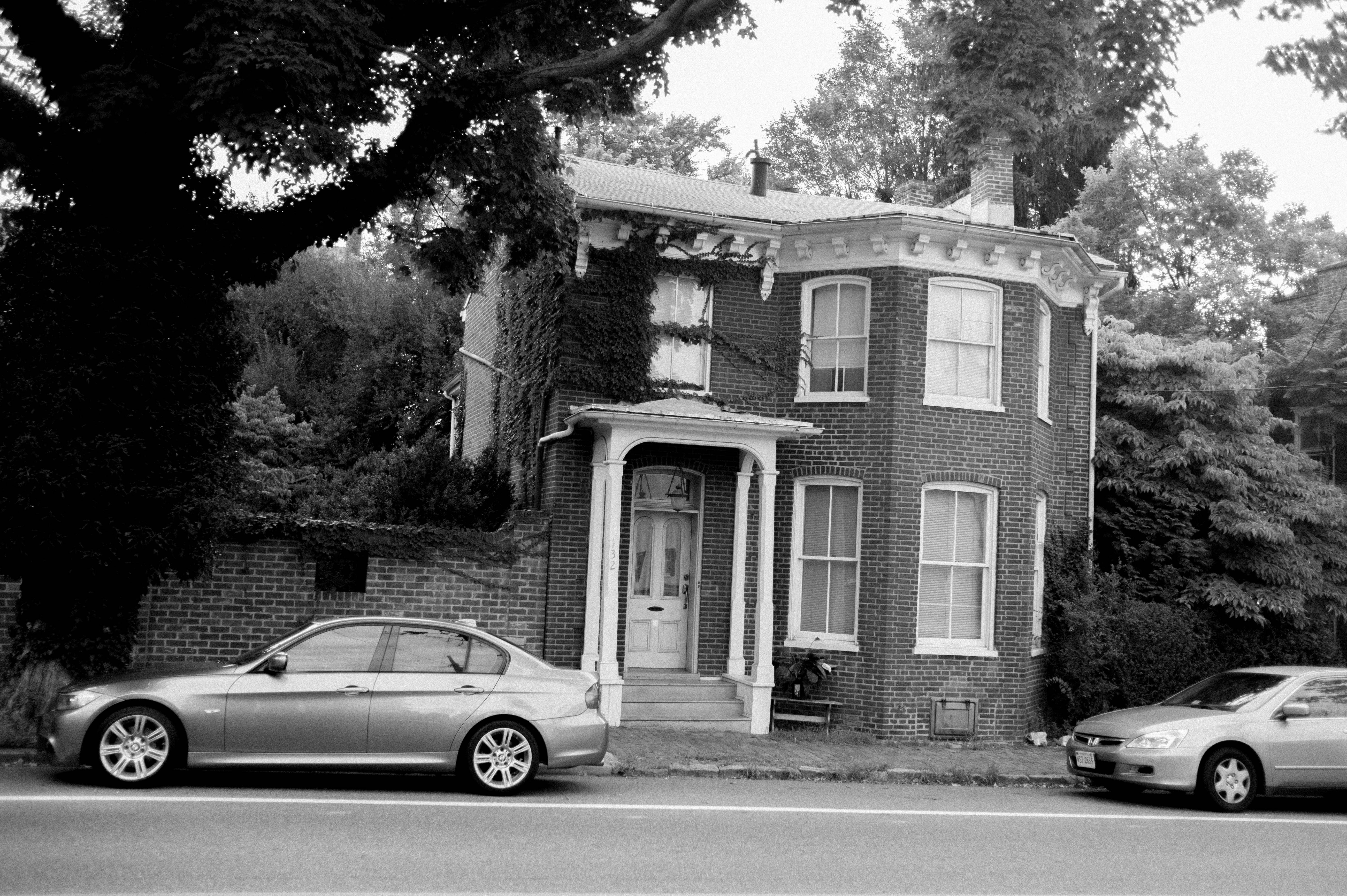 This photograph captures a charming brick house, partially enveloped by greenery, standing proudly amidst the encroaching foliage. The black and white tones evoke a sense of nostalgia, while the soft lighting accentuates the textures of the ivy and bricks. Two parked cars frame the scene, hinting at the blend of past and present in this quiet neighborhood.