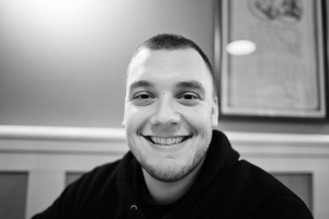 The photograph features a young man smiling warmly, exuding a sense of genuine happiness and approachability. Soft, diffused lighting enhances his features and creates a relaxed atmosphere, while the subtle background elements hint at an intimate setting. The monochrome palette adds a timeless feel to the moment, focusing attention on his cheerful expression.