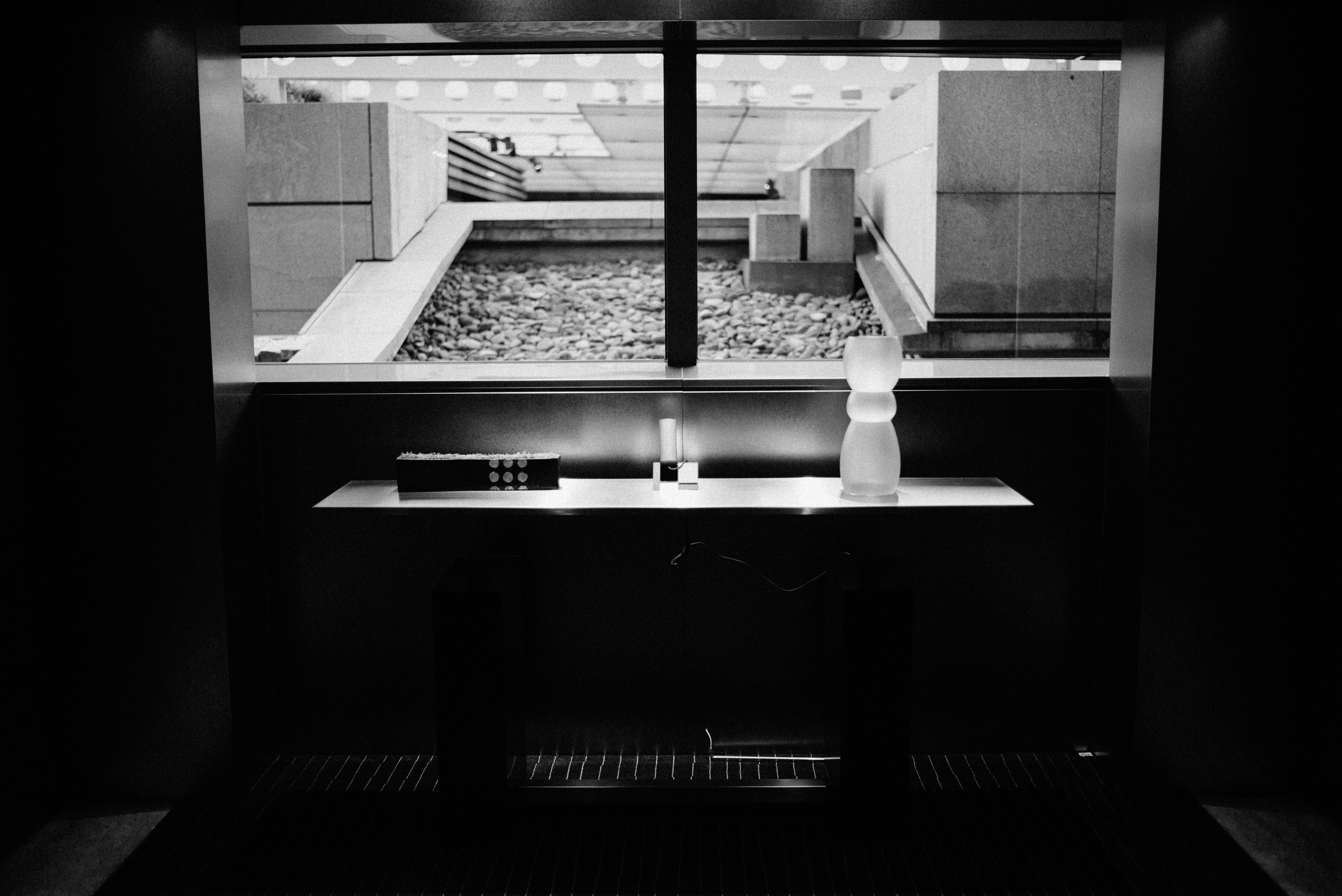 The photograph captures a minimalist interior scene framed by a large window, juxtaposing the structured lines of the room with the natural textures outside. Soft, diffused light spills into the space, highlighting a sleek table adorned with a simple vase and contrasting against the stark darkness surrounding it. This monochromatic composition evokes a sense of calm introspection, inviting the viewer to reflect on the interplay between indoor design and the outdoor world.