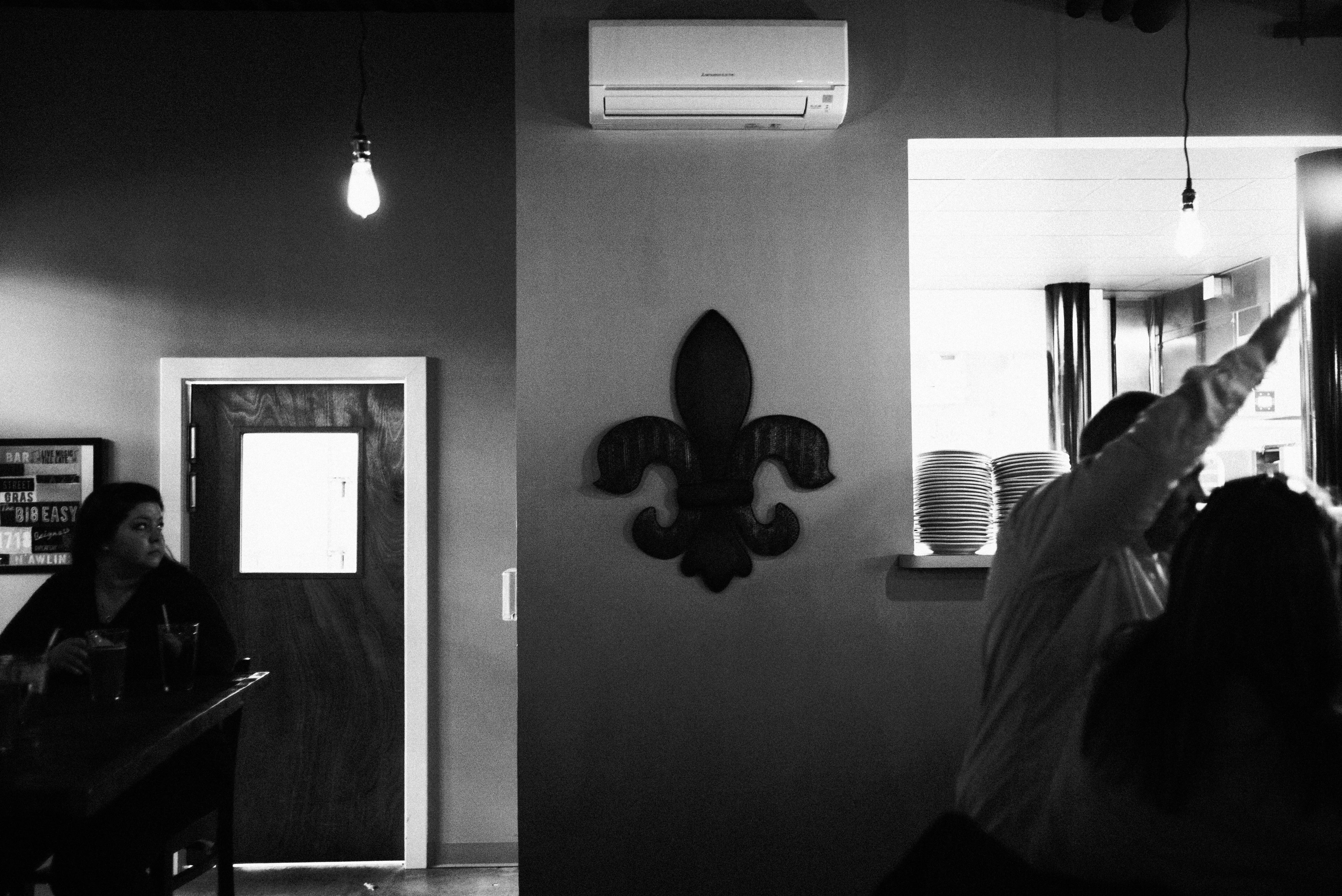 This intimate black-and-white photograph captures a moment in a cozy eatery, where a lone woman gazes away from the viewer, embodying a sense of thoughtfulness and introspection. The soft lighting from the hanging bulb casts a warm glow, contrasting with the starkness of the room’s minimalist decor, marked by an ornate fleur-de-lis. The composition invites contemplation, drawing attention to the quiet atmosphere and the subtle interactions within the space.