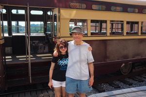 In this warm photograph, a young woman and an older man share a tender embrace in front of a historical train car, radiating joy and connection. The bright sunlight casts a cheerful glow, illuminating their smiling faces and the rich textures of the vintage train, enhancing the nostalgic atmosphere of the scene. Their casual attire suggests a relaxed summer outing, inviting viewers into a moment of shared happiness and companionship.
