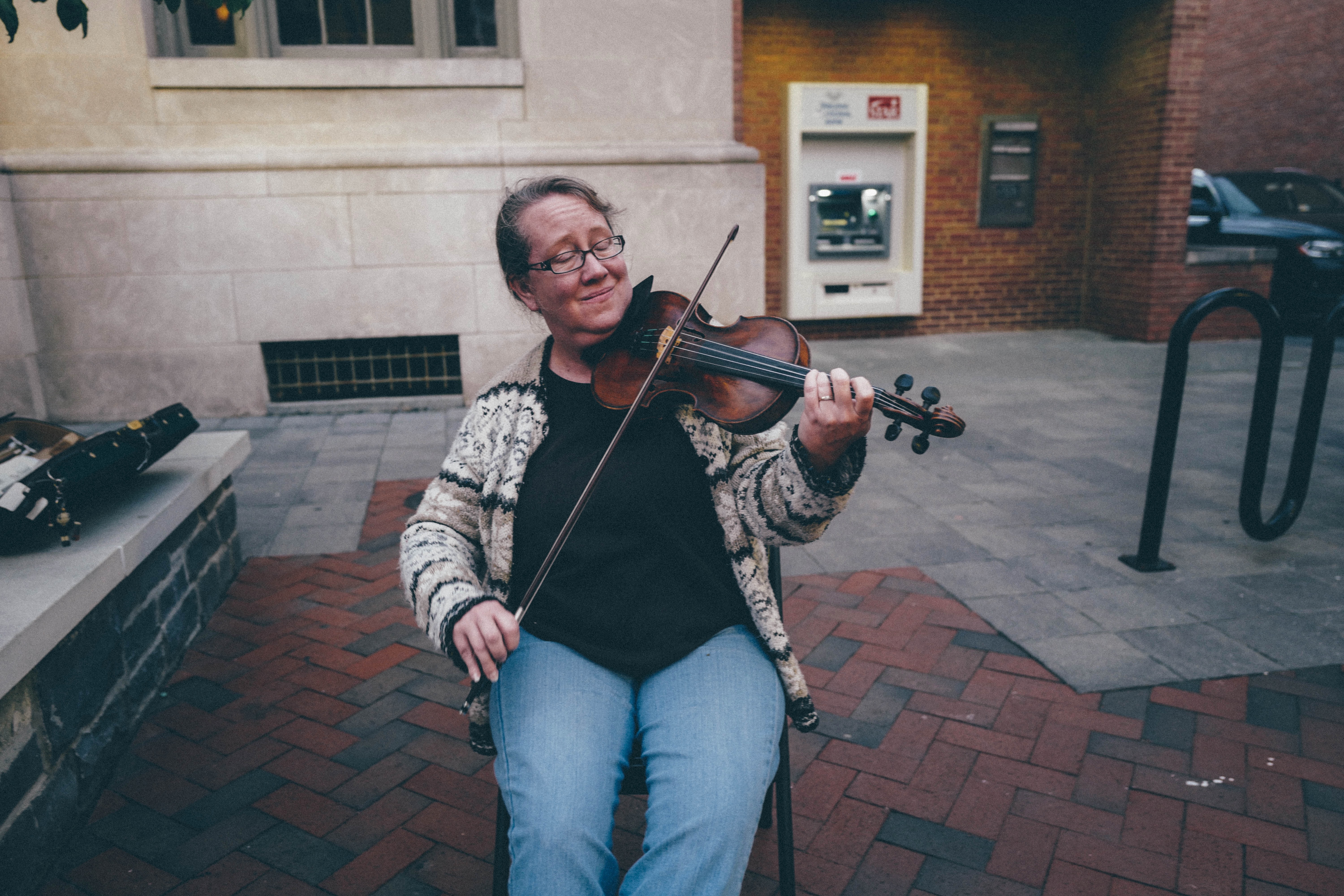 The photograph captures a joyful woman playing the violin on a quiet street corner, dressed in a cozy, patterned sweater and blue jeans. The soft, warm lighting highlights her focused expression, creating an intimate and inviting atmosphere amidst the urban backdrop. The brick pavement and subtle architectural details accentuate the sense of community and connection through music.
