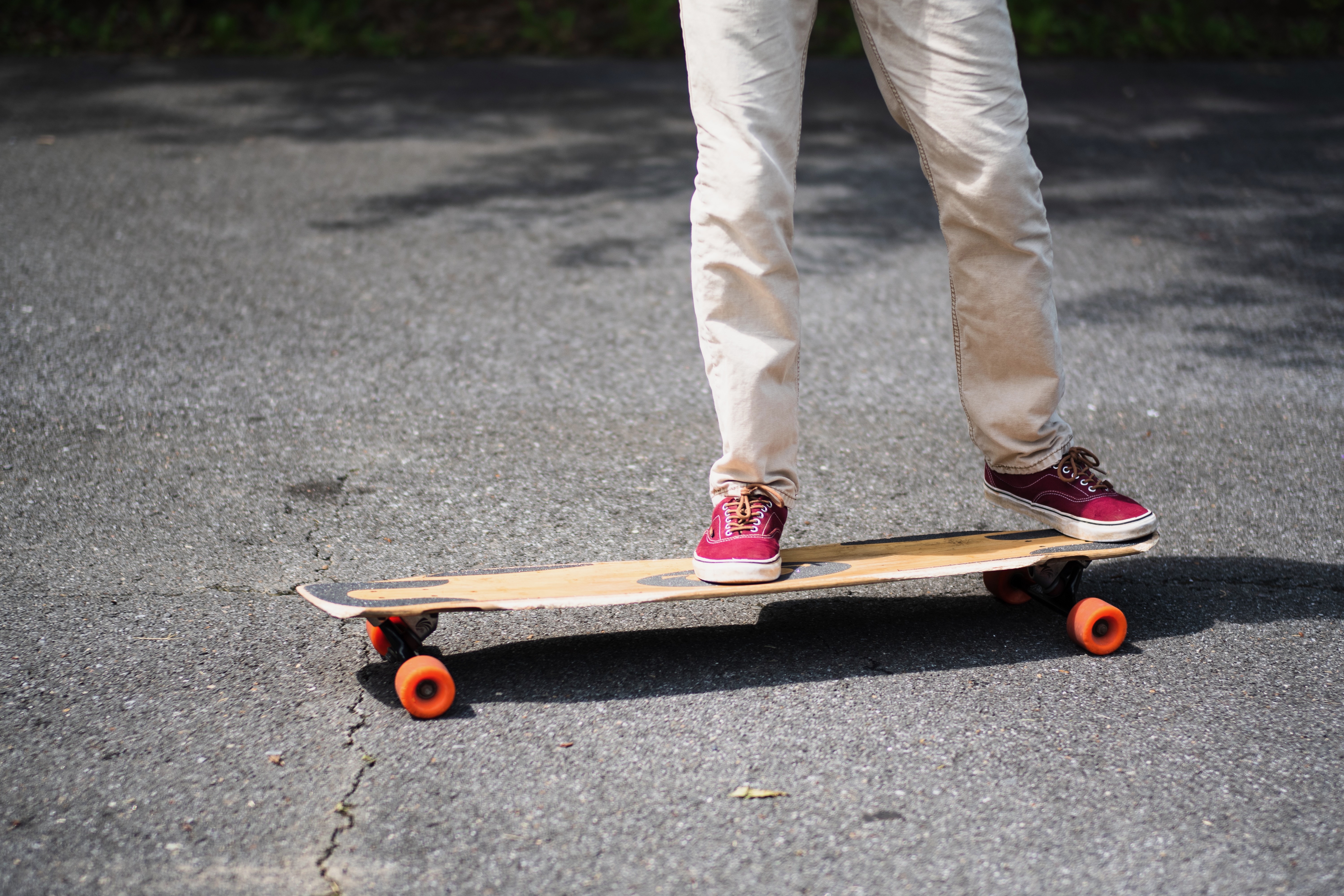 A skateboarder stands poised on a longboard, a moment of calm before movement. The warm sunlight casts dynamic shadows on the asphalt, enhancing the laid-back yet focused mood. With casual attire and vibrant shoes, the scene embodies the spirit of youthful adventure and freedom.