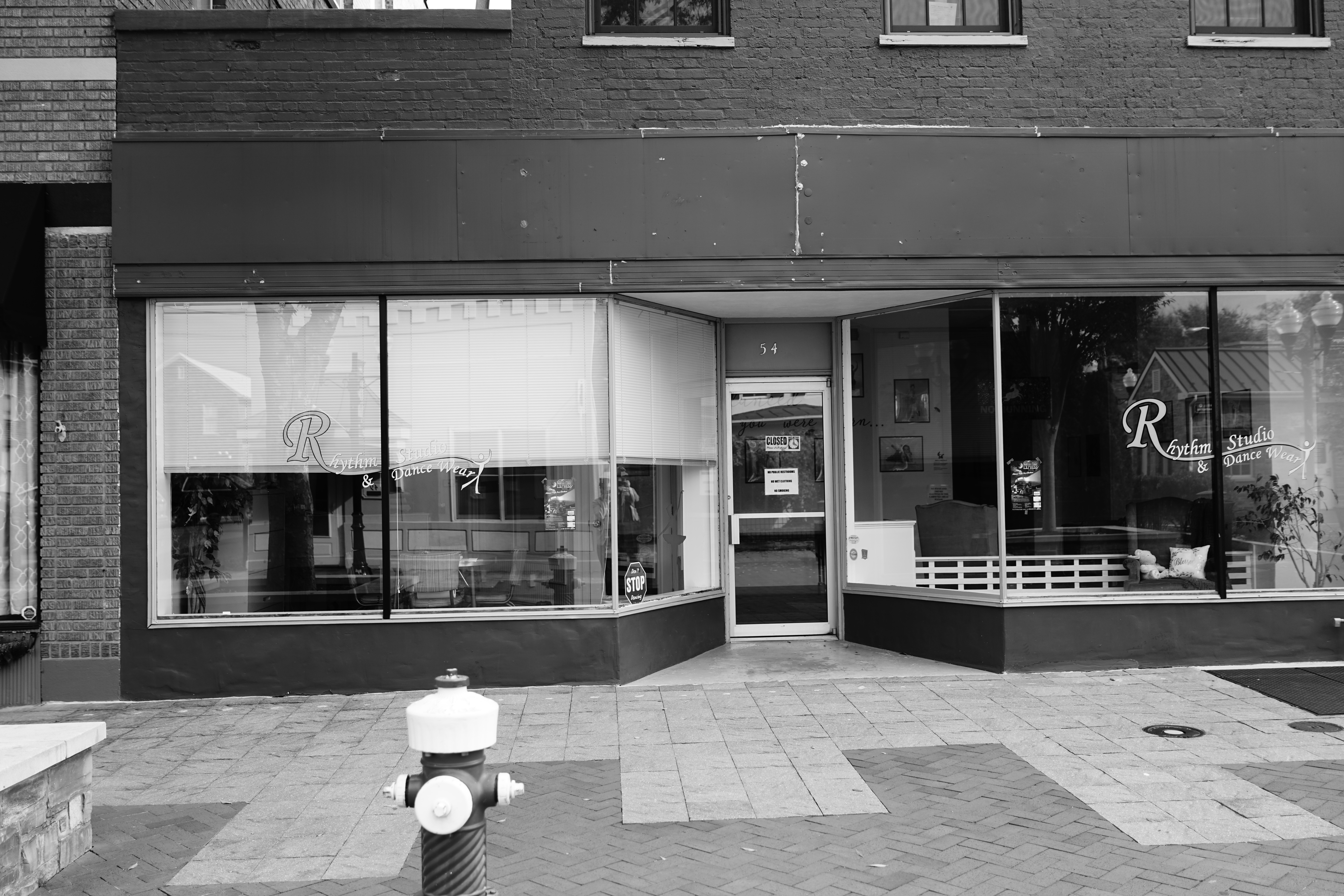 The photograph captures a quiet street view of a dance studio, its glass facade reflecting a tranquil, still atmosphere. The monochrome palette enhances the simplicity and nostalgic charm of the scene, while the sparse furnishings visible through the windows evoke a sense of longing. Soft shadows created by the outside light add depth to the composition, inviting viewers to ponder the stories held within its walls.