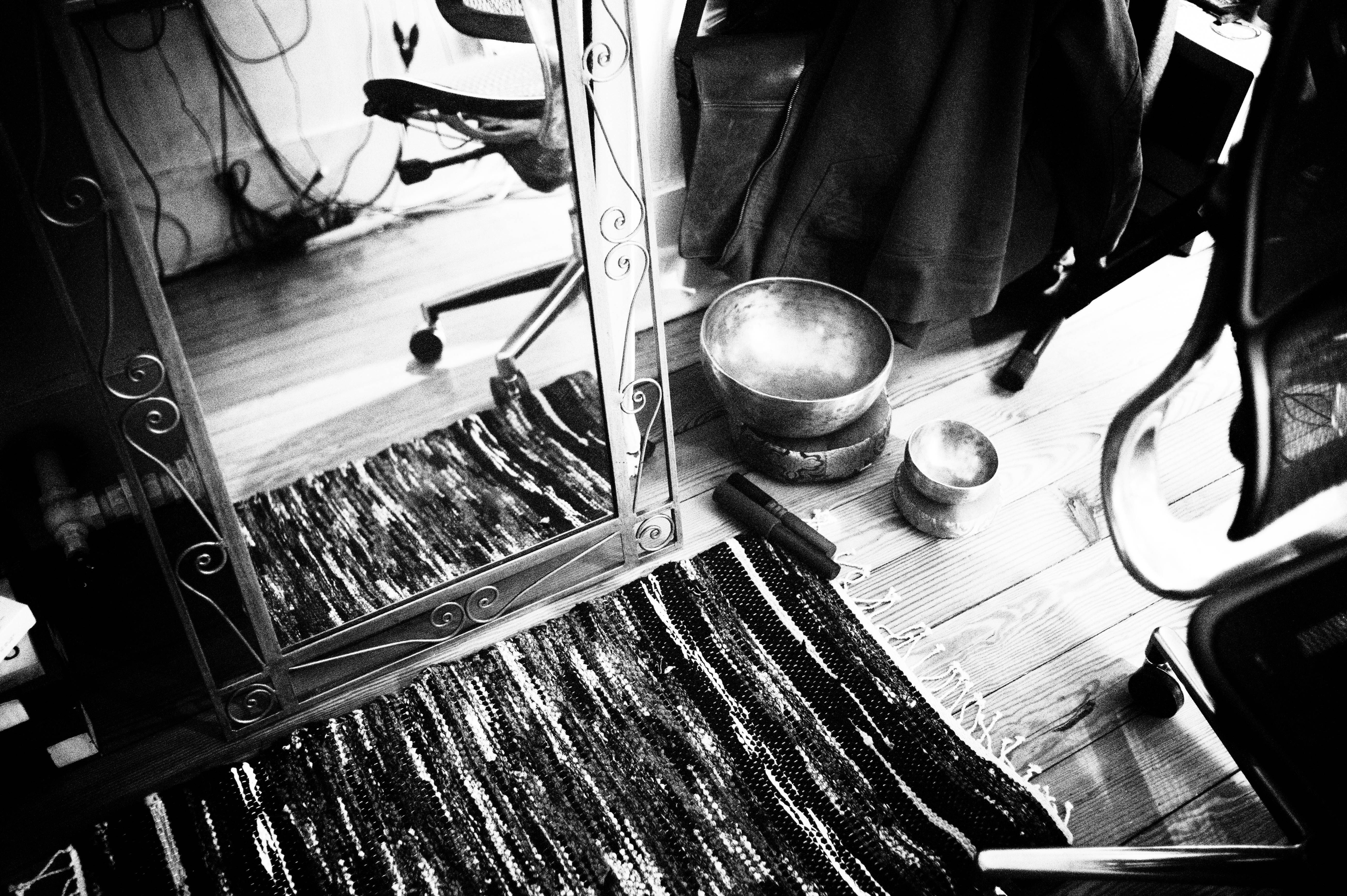 This black-and-white photograph presents a quiet, introspective scene captured within a cluttered space. A mirror reflects disarray, with a softly lit floor showcasing a textured rug, while musical bowls hint at tranquility against a backdrop of everyday life. The mood is contemplative and serene, inviting the viewer to pause and reflect amidst the chaos.