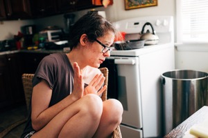The photograph captures a young woman sitting in a chair, her body curled inward as she expresses a moment of contemplation or distress. Soft, natural light filters through the window, illuminating her delicate features and the cluttered kitchen background, which contrasts with her serene posture. The composition evokes a sense of intimacy and vulnerability, inviting viewers to ponder her thoughts and emotions.
