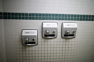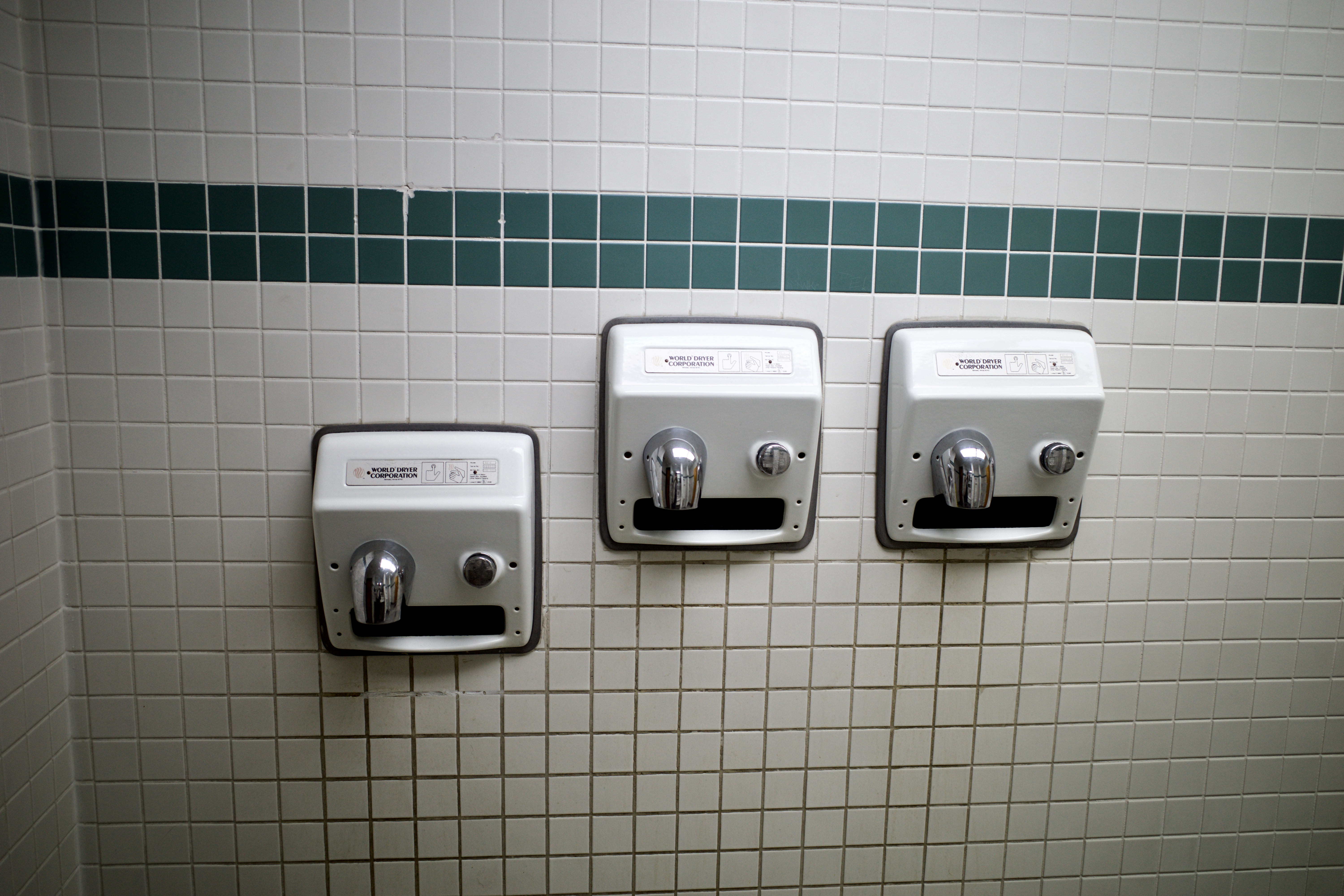 Three white hand dryers line a tiled wall, their gleaming chrome accents contrasting with the muted tones of the surrounding tiles. Subtle shadows cast by overhead lighting evoke a sterile, yet inviting atmosphere. The simple composition draws attention to the functionality of the objects, creating a mood of quiet efficiency and cleanliness.