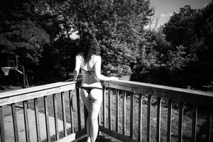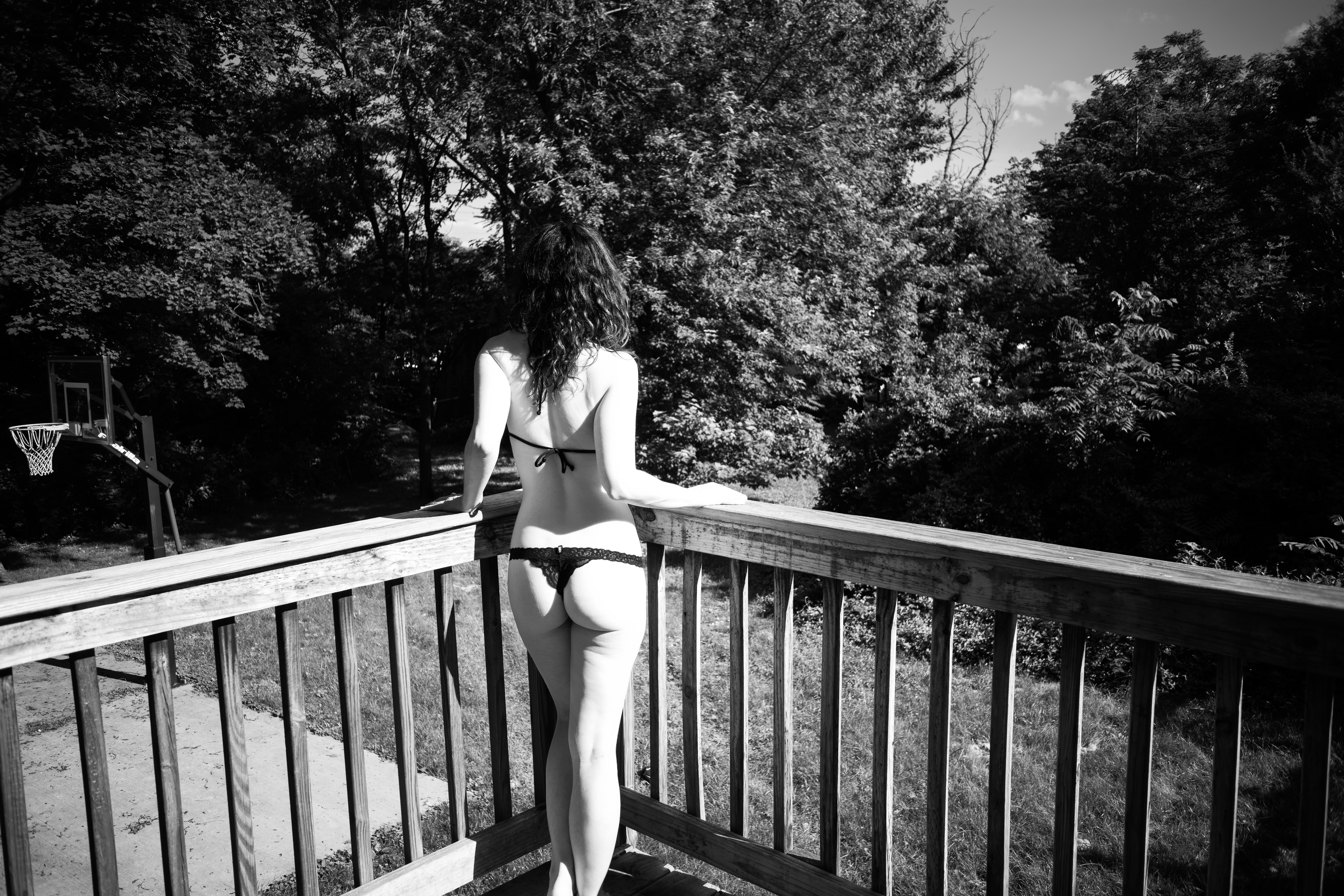 In a moment of quiet solitude, a figure stands on a wooden deck, bathed in soft natural light. The contrast between the dark clothing and the lush greenery creates an intimate yet serene atmosphere. The black-and-white composition amplifies the sense of peaceful reflection, inviting the viewer to contemplate the beauty of the scene.