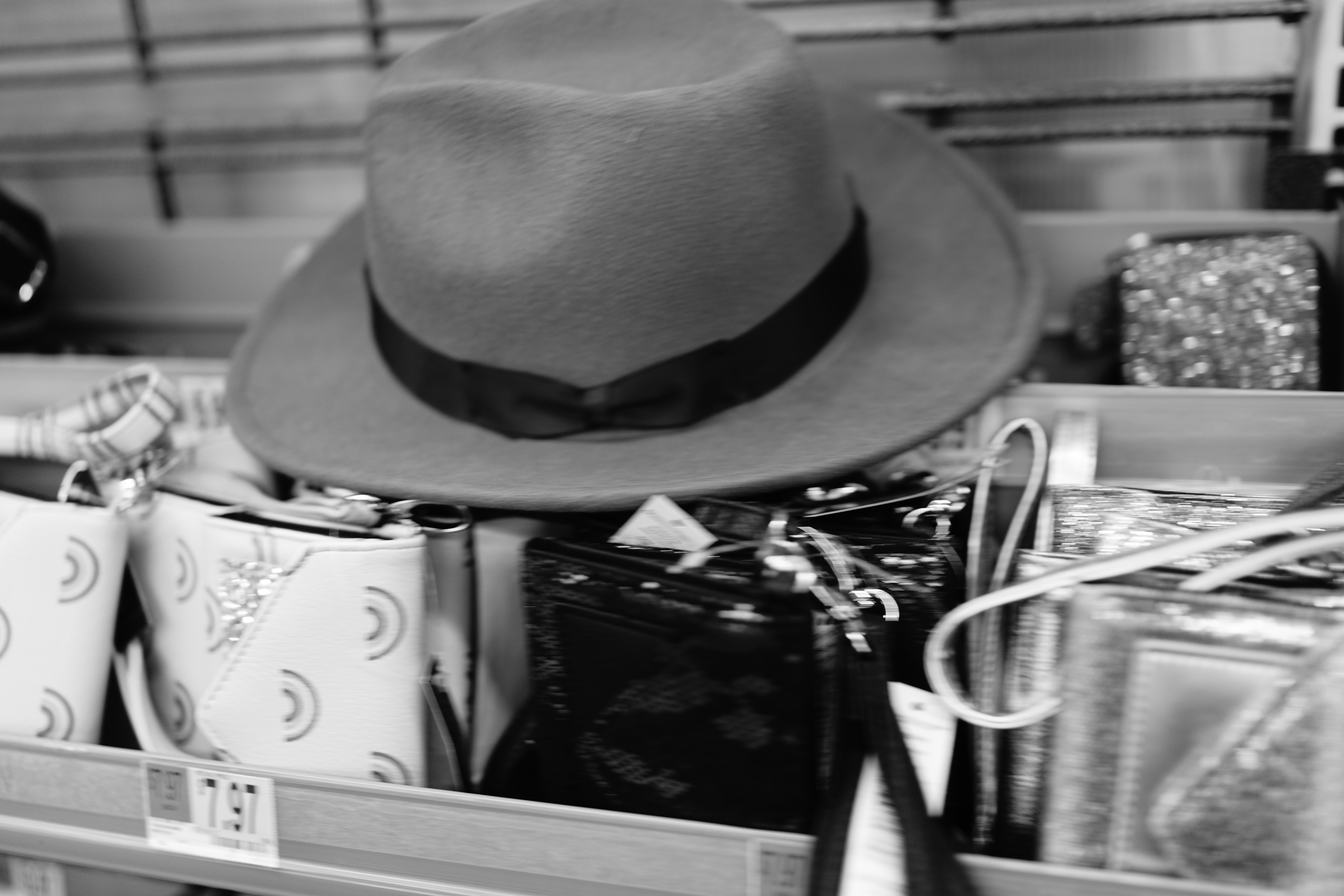 This monochromatic photograph captures a stylish hat resting atop a chaotic arrangement of handbags. The soft lighting creates a nostalgic mood, while the contrasting textures highlight the elegance of the hat against the playful designs below. The composition draws the eye to the central hat, evoking a sense of timeless fashion amid the clutter of modern accessories.