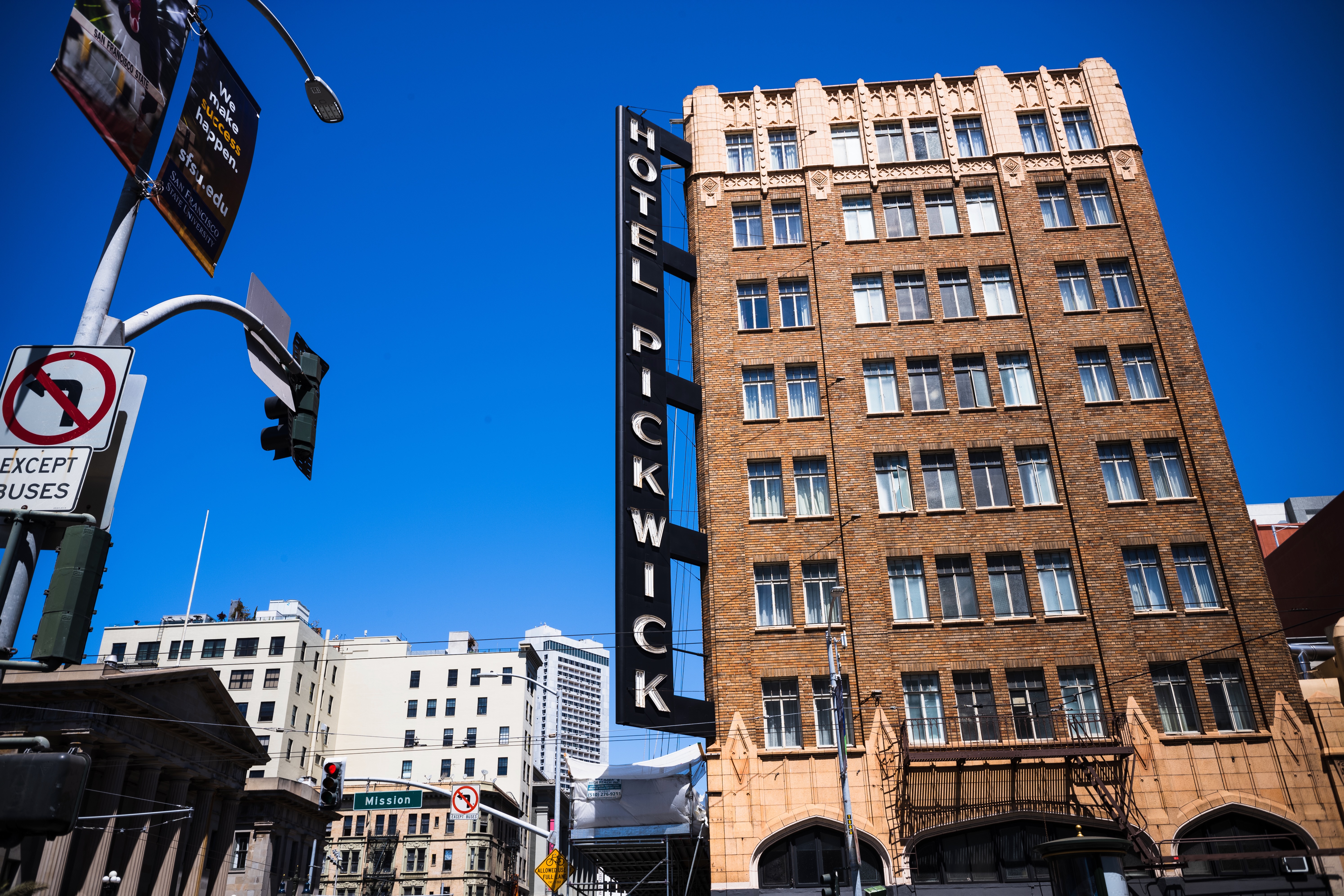 The photograph captures the distinctive Hotel Pickwick, its vintage architecture set against a brilliant blue sky, evoking a sense of nostalgia for a bygone era. Sunlight bathes the building in warmth, highlighting the intricate details of its facade while the surrounding urban elements frame the scene, creating a vibrant city mood. The composition draws the eye upward, inviting viewers to explore the architectural character in the heart of the bustling streets.