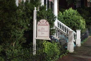The photograph captures the inviting sign of the Old Watersstreet Inn illuminated softly under the night sky. Lush greenery surrounds the sign and the entrance, creating a sense of tranquility and charm. The warm lighting contrasts beautifully with the darkness, evoking a cozy, welcoming atmosphere.