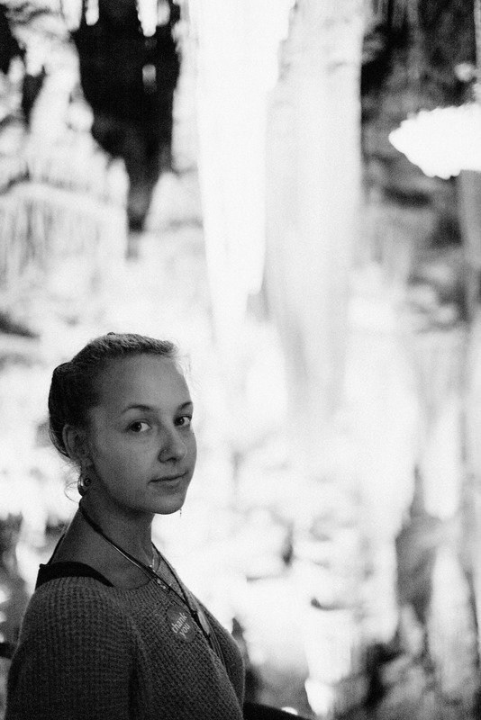 In this evocative black-and-white photograph, a young woman gazes softly towards the camera, her expression contemplative as she stands amidst the enchanting backdrop of a cave. The dim lighting highlights the intricate formations surrounding her, casting an ethereal glow that enhances the mysterious atmosphere. The composition draws focus to her serene presence, contrasting beautifully with the rugged elegance of the cave's stalactites and shadows.
