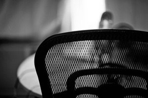 In this monochromatic photograph, the back of a sleek, modern chair dominates the foreground, hinting at an unseen subject. Soft, diffused light filters through the background, creating an atmosphere of anticipation and solitude. The interplay of light and shadow adds depth, drawing attention to the intricate weave of the chair's design while evoking a contemplative mood.
