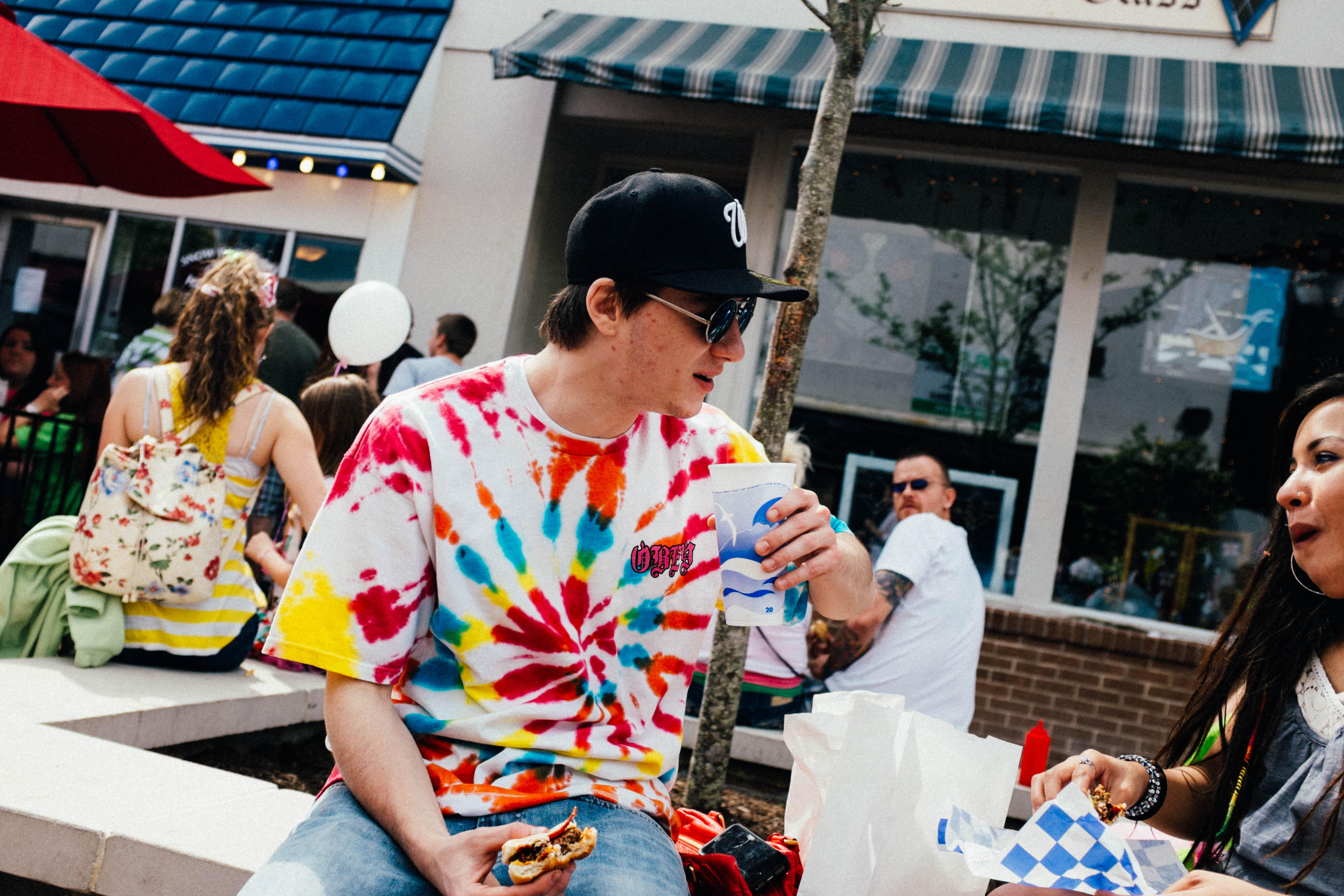 This photograph captures a lively outdoor scene where a young man in a colorful tie-dye shirt enjoys his meal while seated next to a woman, both engaged in conversation. The bright, natural lighting enhances the vivid colors of their attire and the festive atmosphere, while blurred figures in the background contribute to the energetic mood, evoking a sense of community and relaxation.