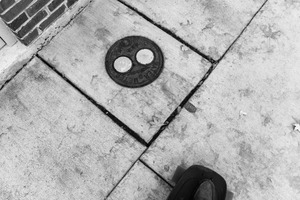 The photograph captures a close-up view of a manhole cover against a backdrop of weathered concrete, combined with subtle autumn leaves scattered across the surface. The stark black-and-white tones enhance the mood of urban solitude, while the angular composition invites the viewer's eye to trace the lines of the pavement and the cover itself. Shadows play across the scene, evoking a sense of stillness amidst everyday life.