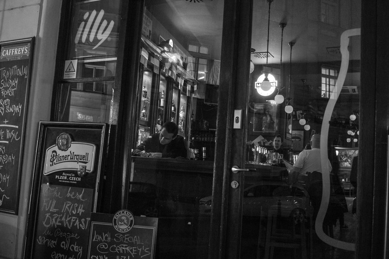 This photograph captures a cozy bar interior, framed by large windows reflecting the outside world. The soft, warm lighting contrasts with the cool tones of the night, creating a welcoming atmosphere. The focus is on patrons engaged in quiet conversation and solitary moments, inviting viewers to step into this intimate setting.