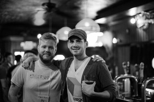 In a cozy bar setting, two friends stand close, embodying warmth and camaraderie under soft, moody lighting. The monochrome tones create a nostalgic atmosphere, emphasizing their relaxed smiles and the intimate vibe of the moment. The blurred background hints at a lively social scene, while the focus remains on their easy rapport and shared joy.