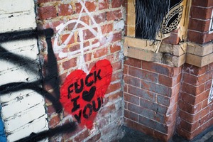 A vibrant red heart emblazoned with the bold phrase 'FUCK I ♥ YOU' stands out against the gritty, textured backdrop of a brick wall, layered with other graffiti and urban decay. Natural light casts dynamic shadows, enhancing the rebellious mood and the juxtaposition of love and defiance. The composition draws the eye to both the central message and the chaotic beauty surrounding it, creating a striking commentary on street art culture.