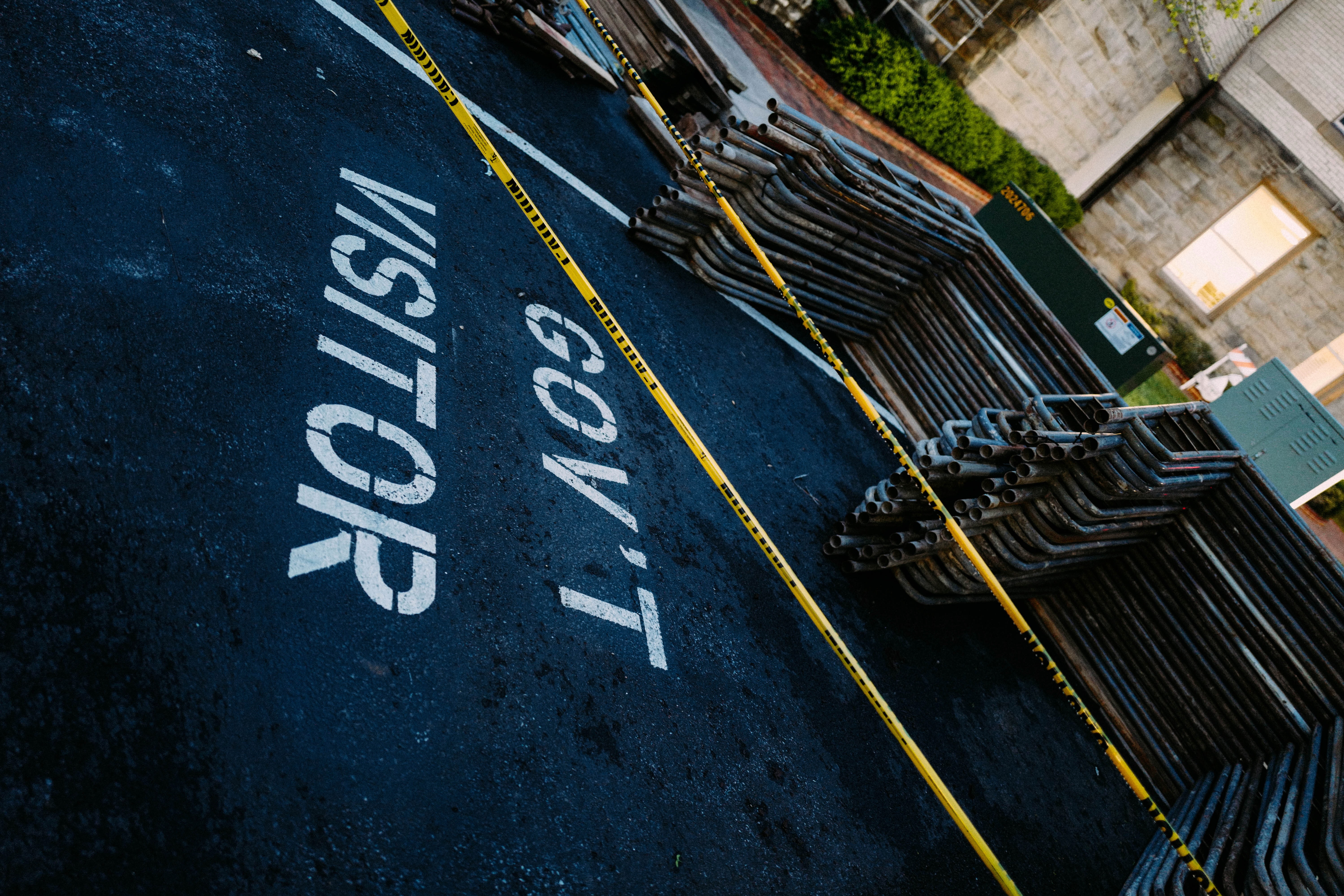 This photograph captures a stark urban scene where a freshly painted visitor parking space is juxtaposed against disorganized stacks of scaffolding pipes. The composition is strikingly diagonal, drawing the eye towards the disorderly piles that overshadow the clear signage. Soft evening light casts shadows and highlights the textures of the materials, evoking a sense of stagnation and the fleeting nature of progress.