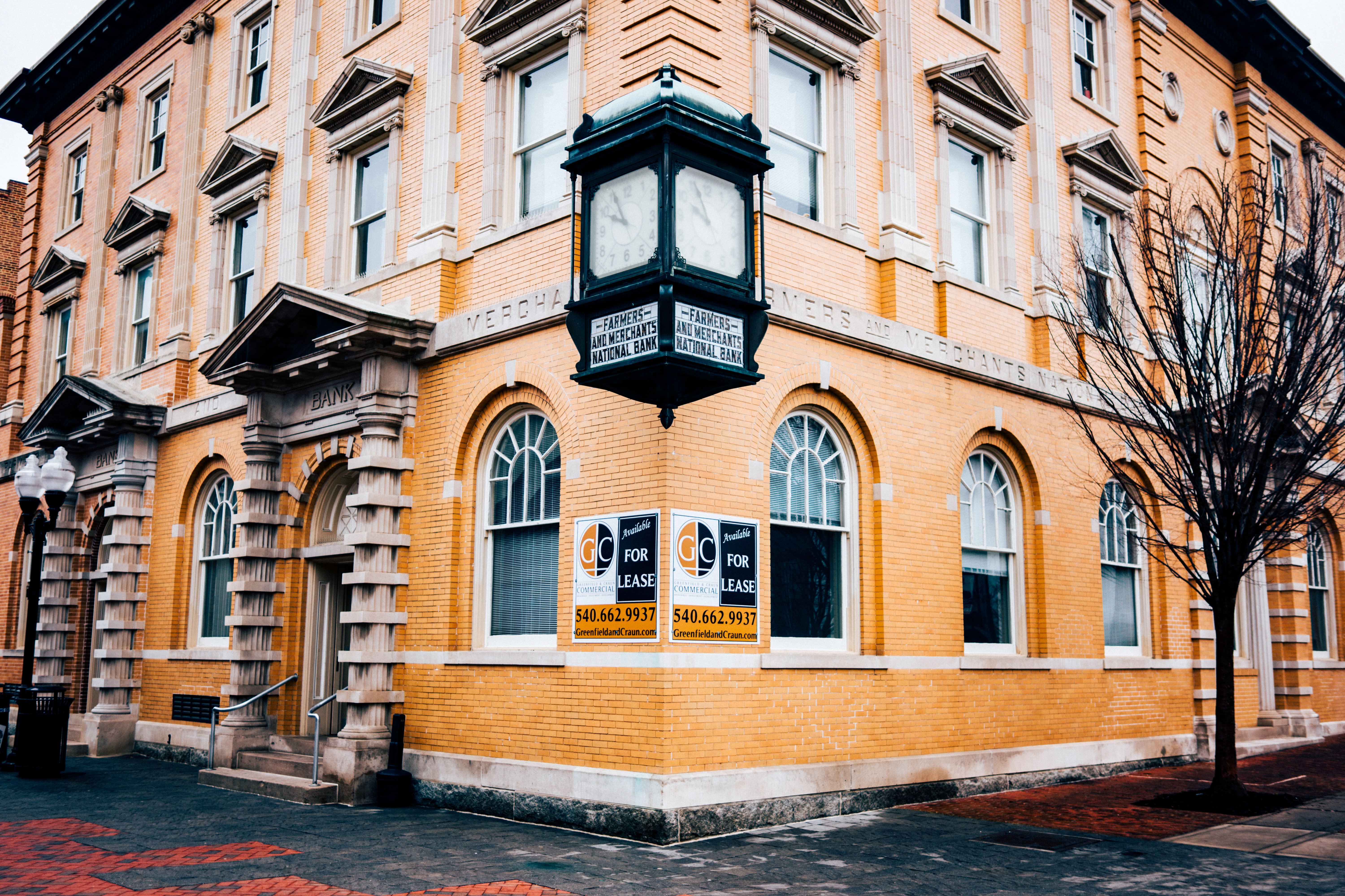 The photograph features a historic brick building displaying its architectural elegance, with a vintage clock hanging prominently. Somber lighting and an overcast sky lend a melancholic atmosphere, while 'For Lease' signs suggest a poignant narrative of changing fortunes. The composition captures the structure at an angle, emphasizing its cornered presence in an urban landscape, evoking a sense of nostalgia and abandonment.