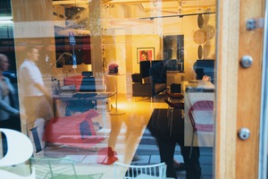 This photograph captures a dynamic interplay between the bustling street and the inviting interior of a modern design space. The warm, amber lighting from inside contrasts with the cooler tones of the exterior, resulting in a cozy yet vibrant mood. Silhouetted figures blend seamlessly into the reflections, creating a layered composition that evokes a sense of connection between the public and the private.