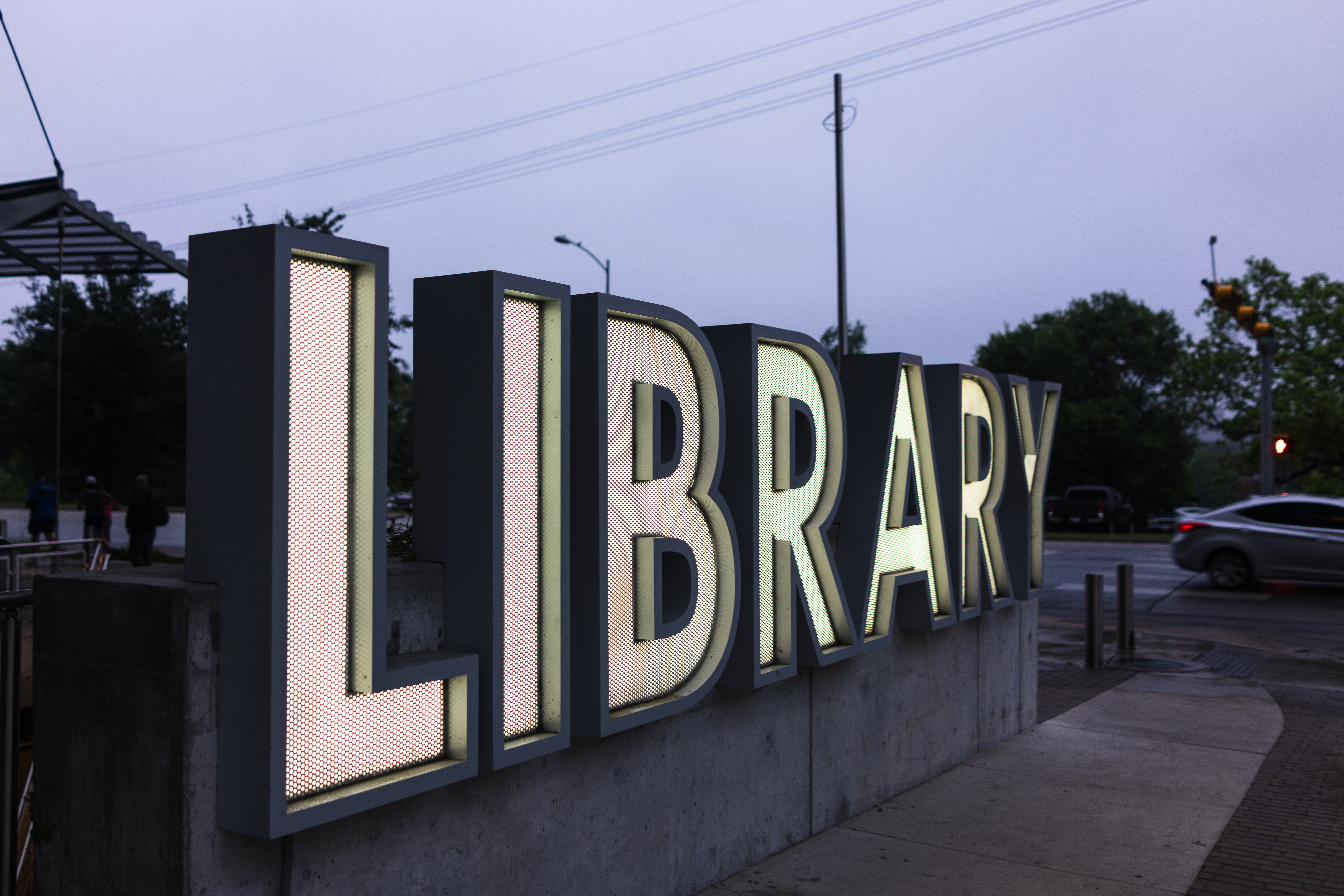 The photograph captures a striking, illuminated sign reading 'LIBRARY' against a dusky backdrop. The soft glow of the letters contrasts with the subdued twilight ambiance, creating a tranquil and inviting mood. The composition emphasizes the sign's bold, modern design while hinting at the quiet activity of the surrounding area, with silhouettes of people in the distance.