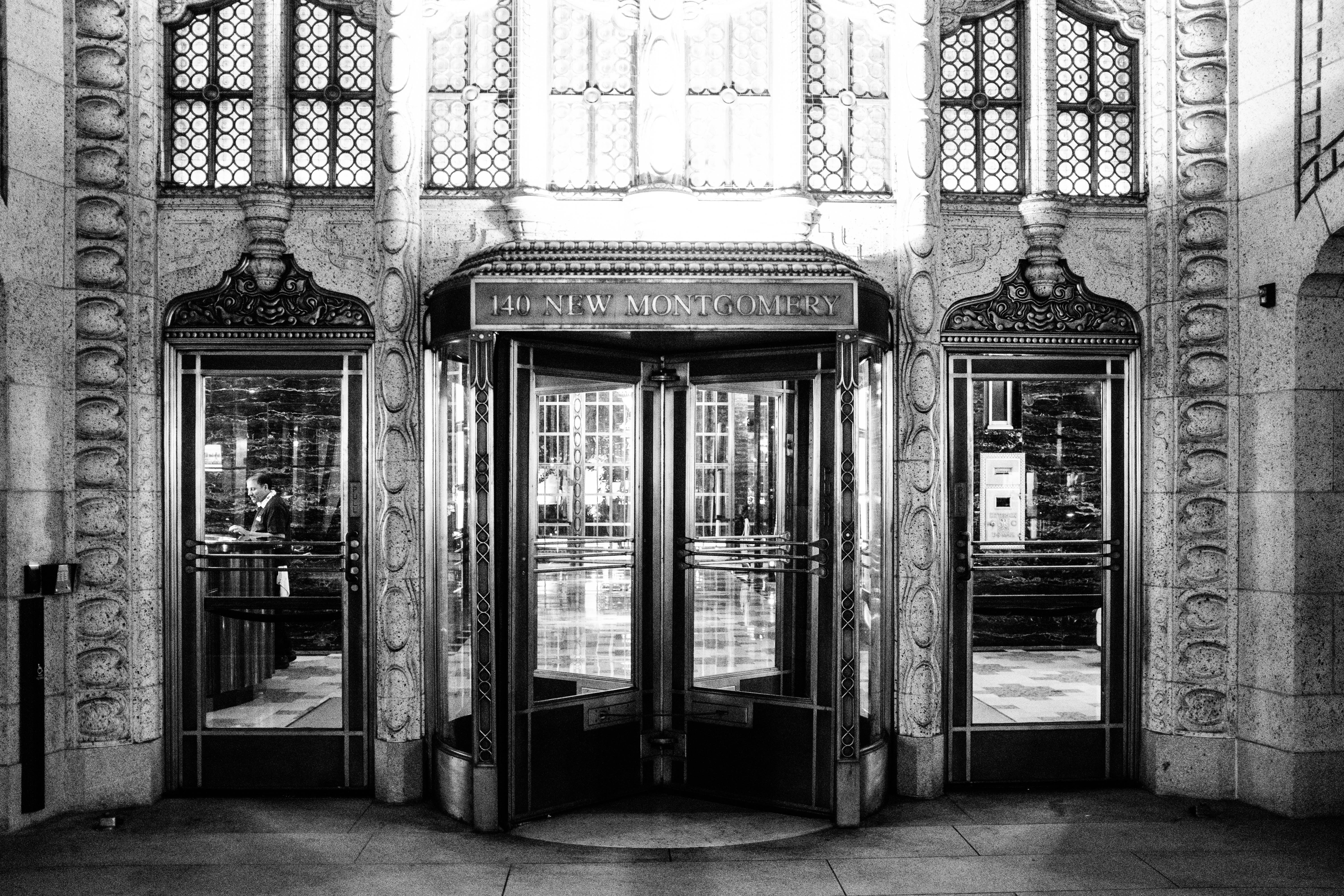 The photograph captures the ornate entrance of 140 New Montgomery, showcasing intricate architectural details framed by a striking contrast of light and shadow. A solitary figure stands contemplatively near the revolving door, adding a touch of solitude to the inviting warmth of the space. The black and white tone heightens the nostalgic atmosphere, evoking a sense of history and sophistication.