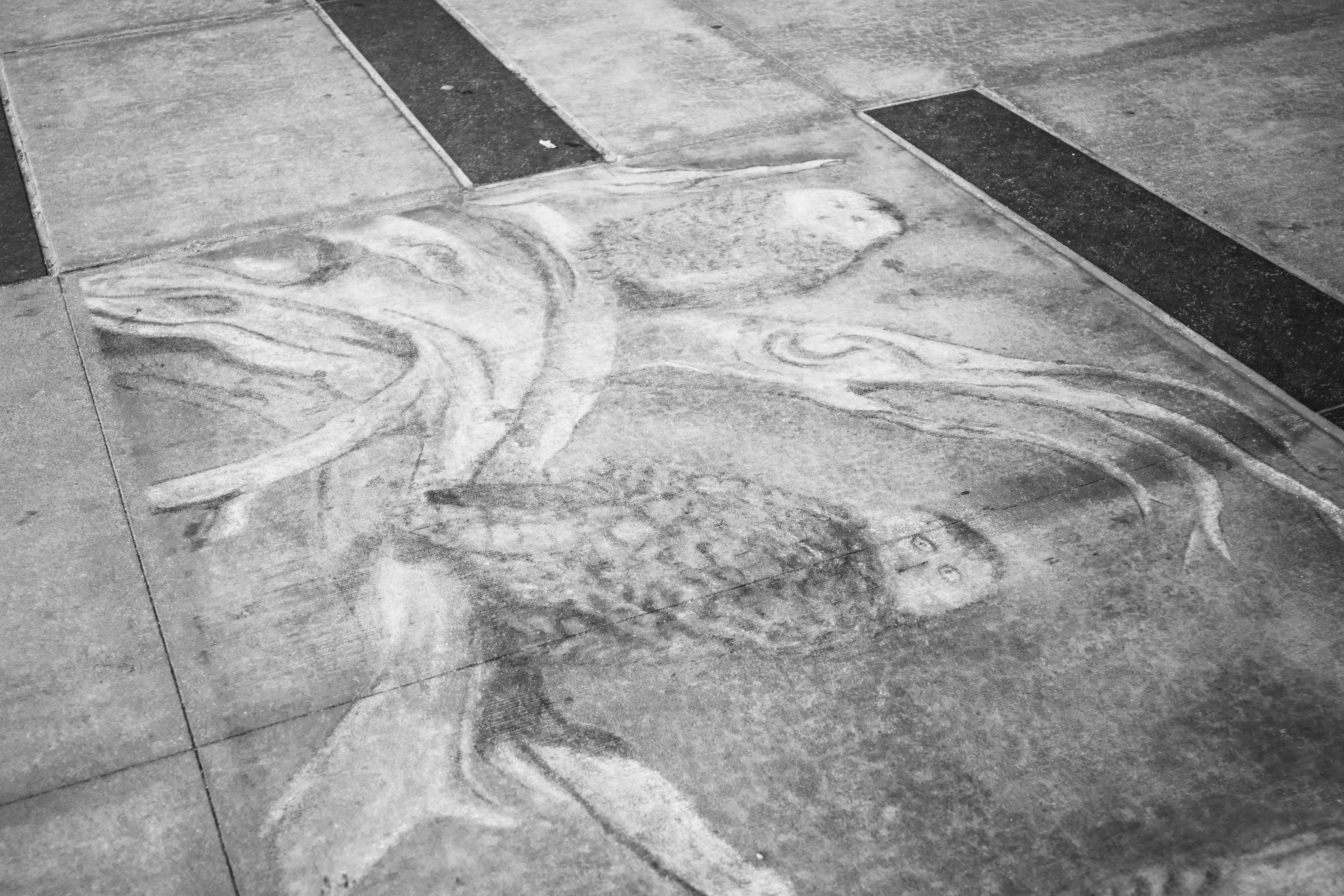 This monochromatic photograph captures an intricate chalk drawing on concrete, depicting owls nestled among abstract organic shapes. The soft, faded lines create a dreamlike quality, evoking a sense of nostalgia and fleeting beauty. Subtle play of light and shadow adds depth, inviting viewers to pause and reflect on the ephemeral nature of street art.
