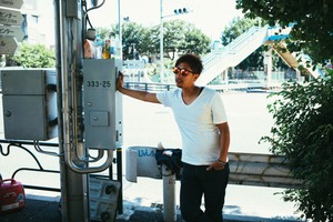 A casually dressed man leans against a metallic box in a sunlit urban setting, exuding a laid-back vibe. The vibrant colors and sharp shadows create a striking contrast against the bright blue sky and green foliage, adding to the tranquil yet lively atmosphere. The composition captures a moment of contemplation amidst the bustling city environment, inviting the viewer to imagine the stories behind the scene.