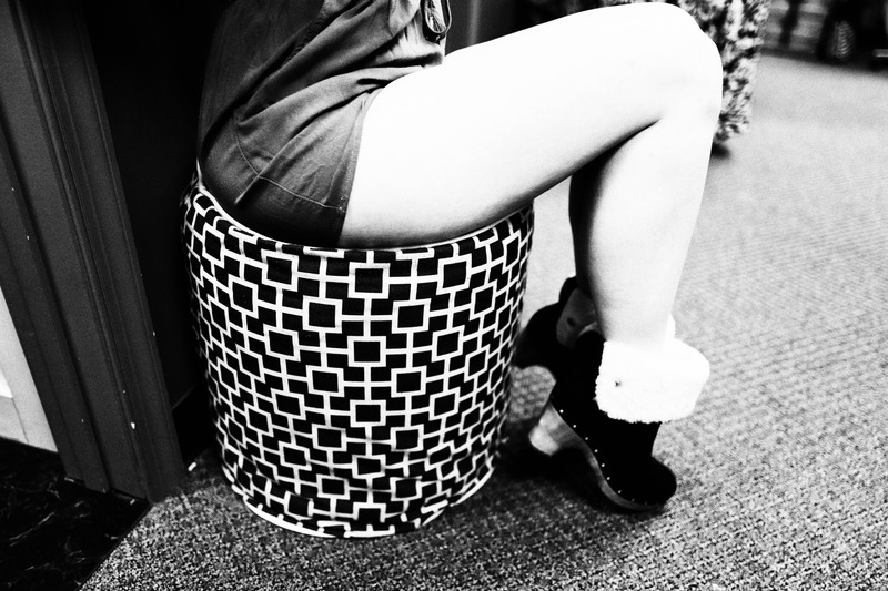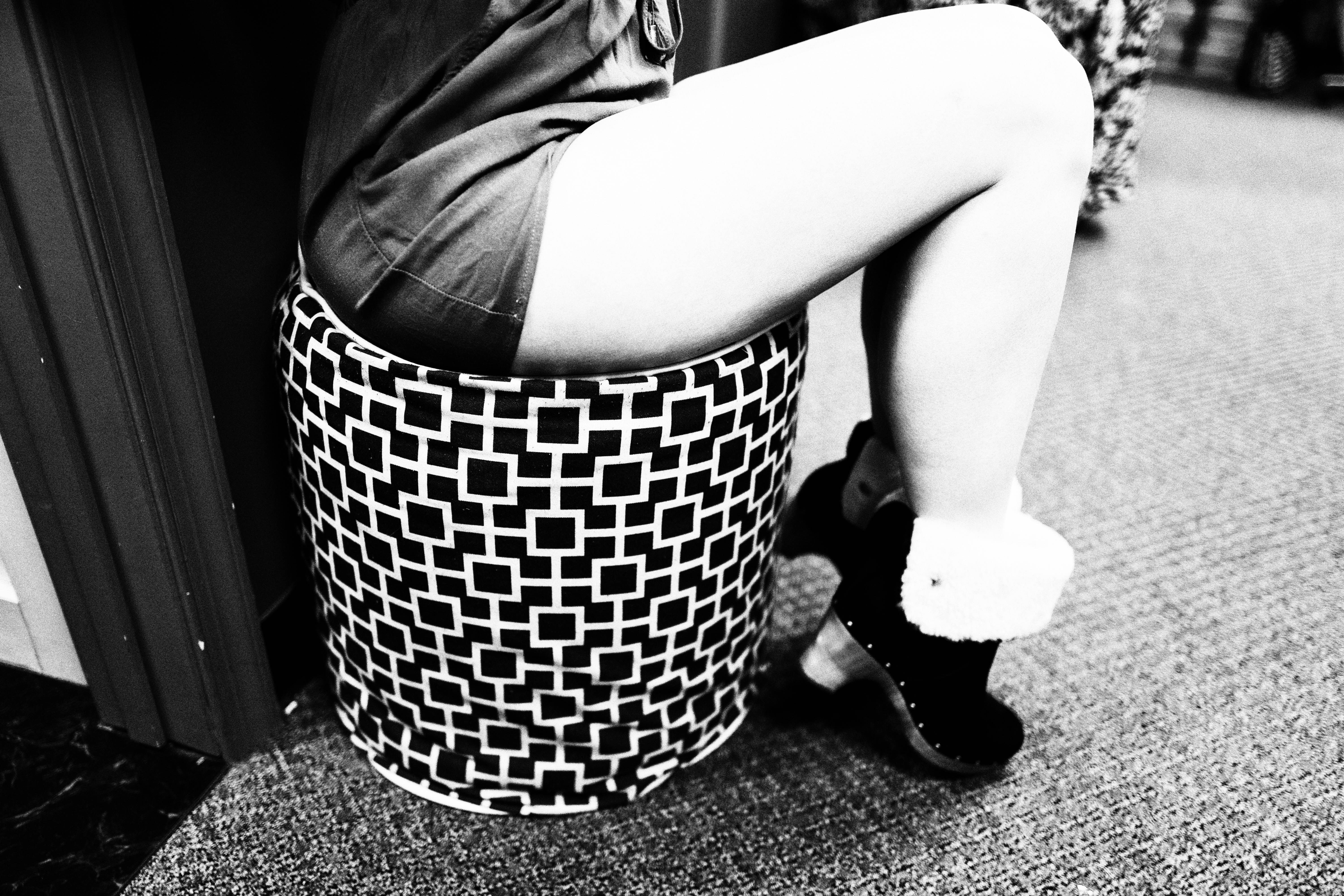 The photograph captures a close-up of a leg draped casually over a patterned stool, creating a sense of relaxed intimacy. The monochrome tones add a nostalgic and sophisticated feel, contrasting the soft textures of the clothing and footwear with the geometric design of the stool. The lighting is subtle, enhancing the curves and shadows, evoking a mood of playful elegance.