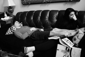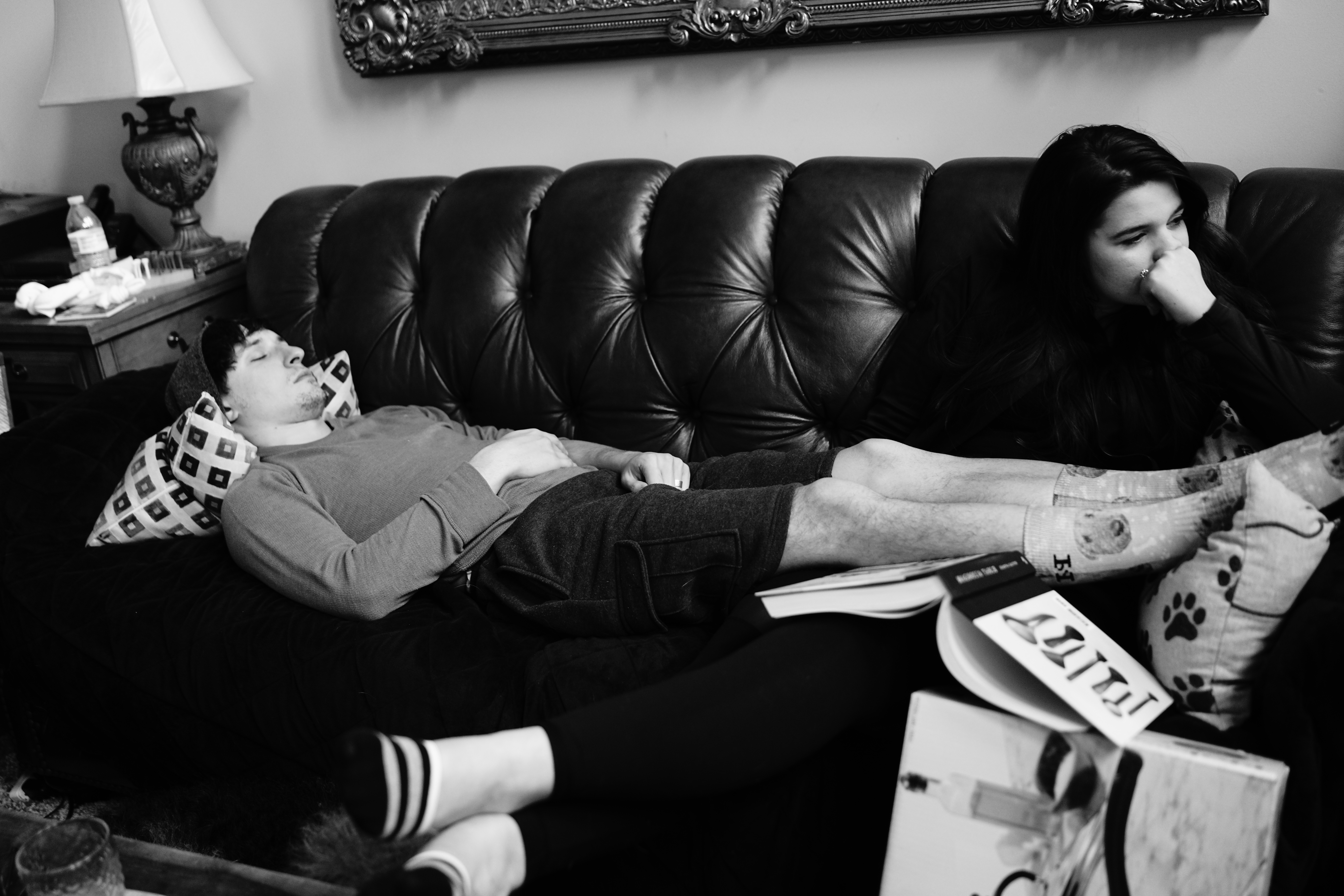 In a cozy living room, two individuals occupy a leather couch, their body language conveying a sense of intimacy and contemplation. The soft, muted light casts gentle shadows, accentuating the contrast between their relaxed poses and the thoughtful expressions on their faces. This monochromatic scene captures a tranquil yet introspective mood, inviting viewers to ponder the stories behind the stillness.