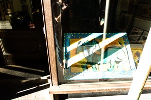 The photograph captures a vibrant artwork displayed in a shop window, illuminated by slanting sunlight that creates striking reflections and shadows. The interplay of color and light evokes a sense of warmth and vibrancy, while faint reflections of the surrounding environment add a layer of depth. This composition invites the viewer to ponder the relationship between art and the world outside its glass enclosure.