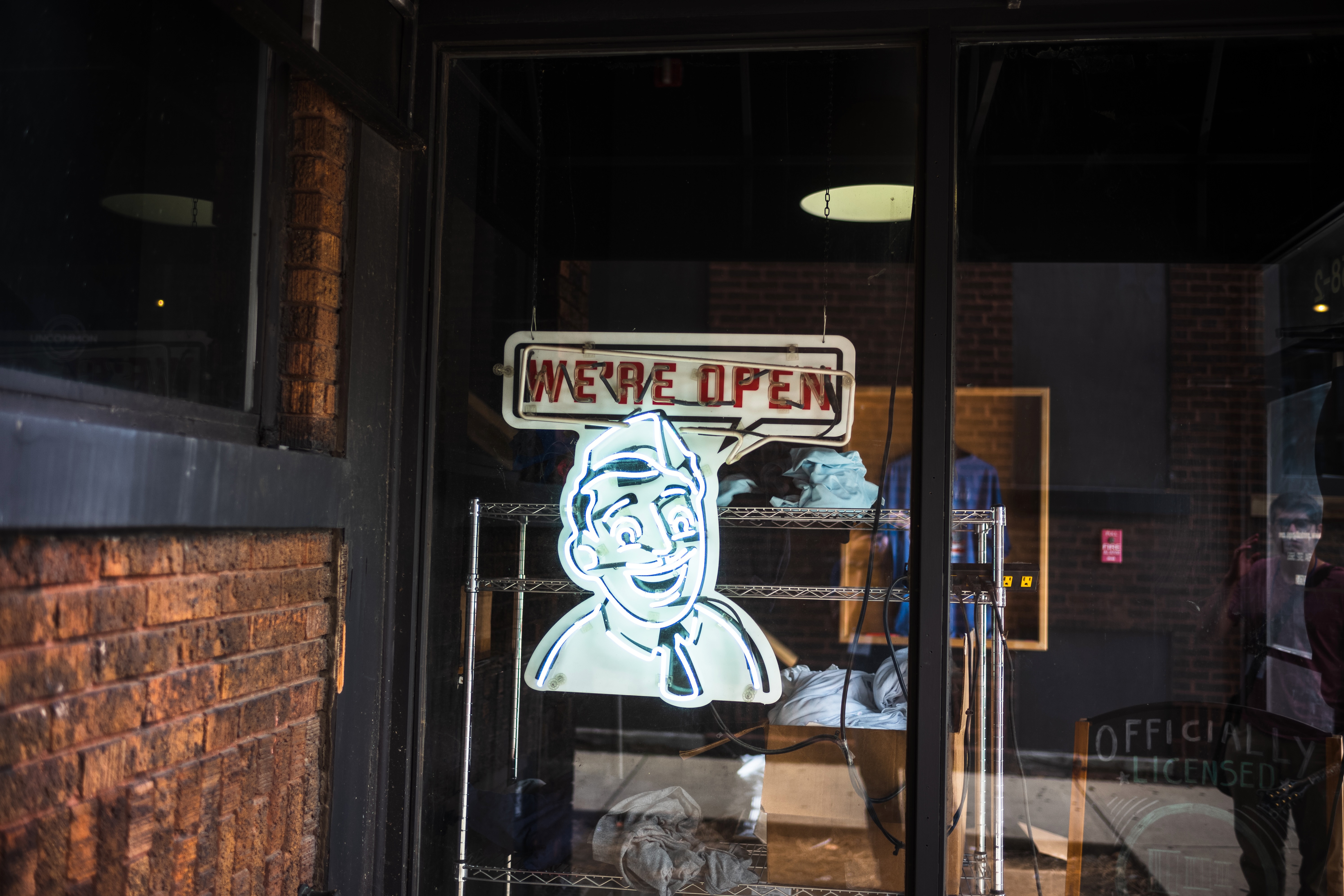 A retro-style neon sign reading "WE'RE OPEN" captures attention in the window of a shop, framed by warm, rustic brick. The cheerful face depicted adds an inviting mood, while soft indoor lighting contrasts with the natural glow outside, creating an atmosphere of warmth and welcome. Reflections hint at the bustling street, blending the shop's charm with the lively urban environment beyond.