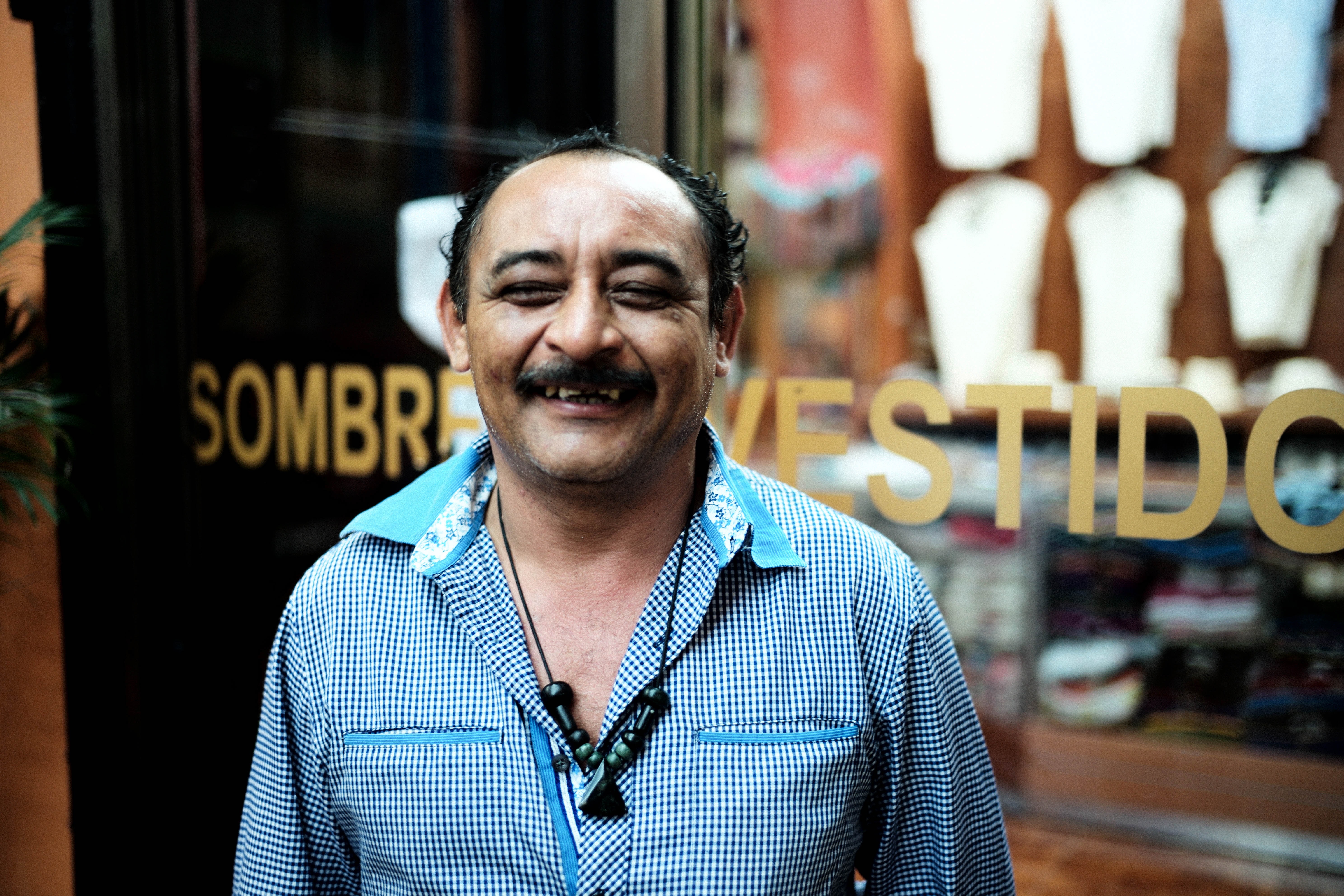 In this vibrant portrait, a man stands smiling warmly against a backdrop of colorful fabric displays. The bright natural light illuminates his friendly expression, creating an inviting atmosphere that captures the essence of a bustling market scene. The contrast between his patterned shirt and the shop's golden lettering emphasizes a sense of local charm and personality.