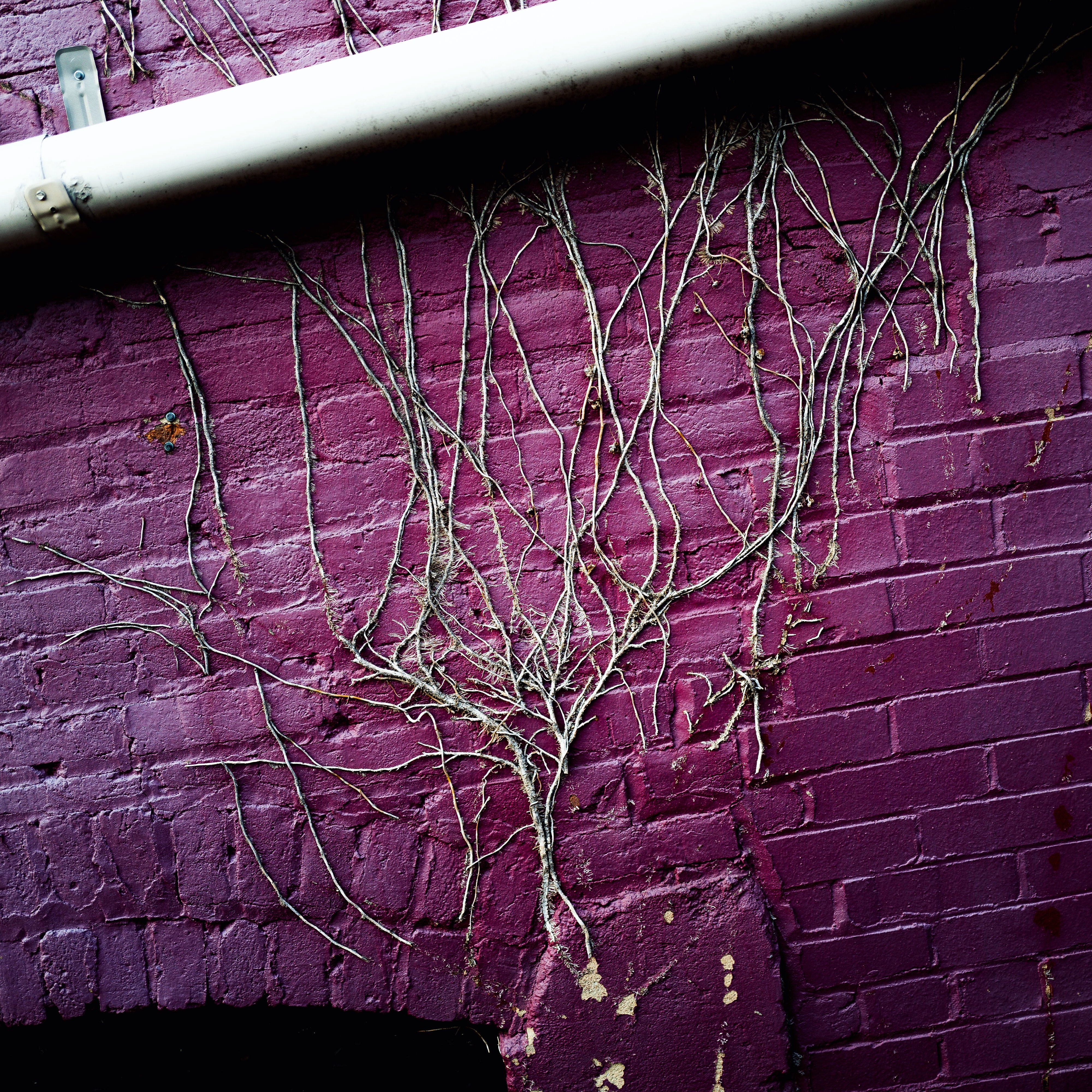 This photograph captures the intricate pattern of dried vines sprawling across a vibrant purple brick wall. The stark contrast between the earthy tones of the vines and the bold hue of the background evokes a sense of resilience and decay, while the subtle play of light accentuates the textures of both the plant and the surface. The composition draws the eye along the chaotic elegance of the vines, creating a striking interplay between nature and urban life.