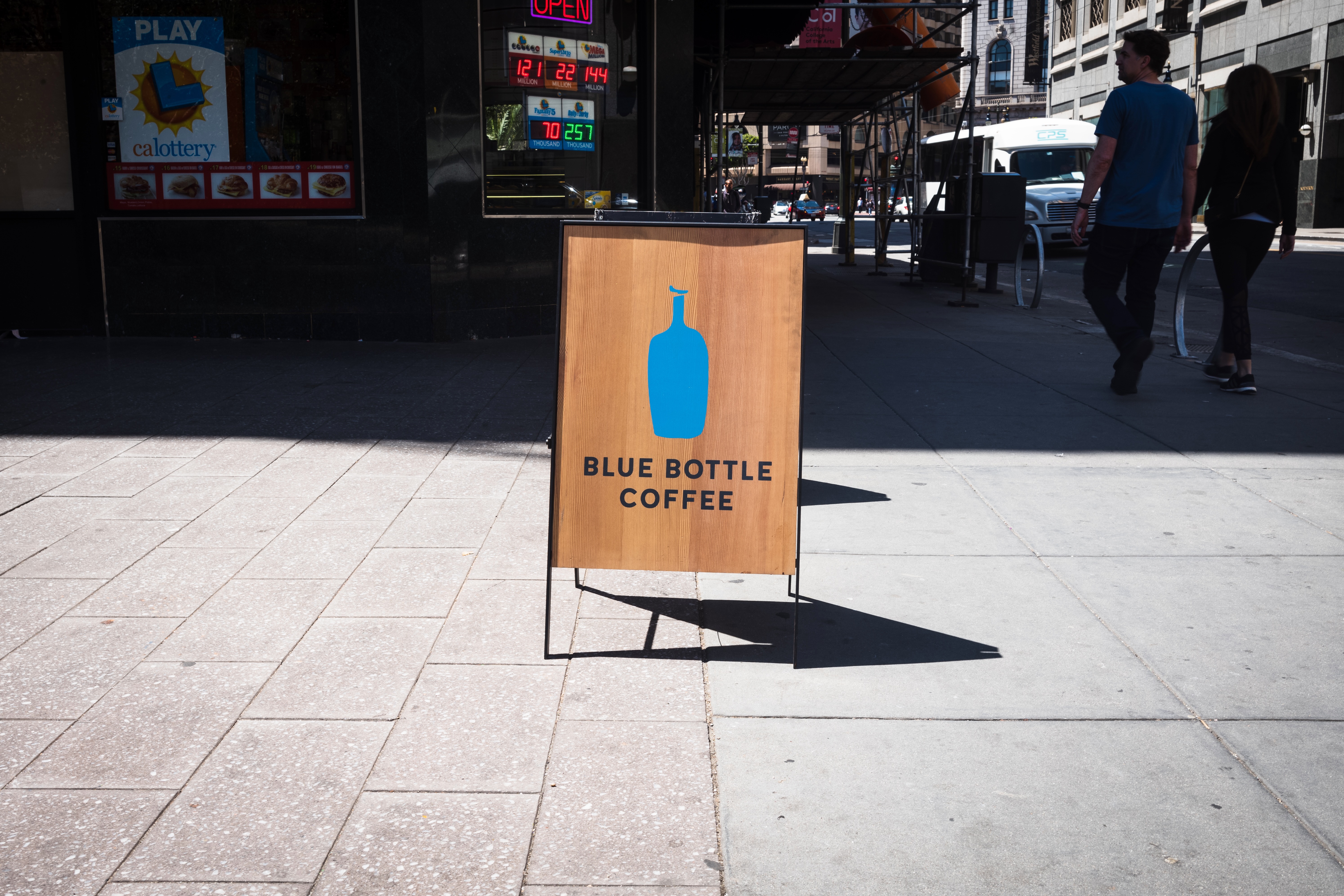 A wooden sign advertising 'Blue Bottle Coffee' stands prominently on a sunlit sidewalk, its vibrant blue logo contrasting against the warm wood grain. The hustle of city life is captured in the blurred figures of pedestrians strolling by, suggesting a lively and inviting atmosphere. Strong daylight casts sharp shadows, enhancing the graphic appeal of this urban moment.