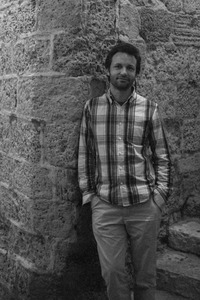 In a softly lit setting, a man leans casually against a textured stone wall, the monochrome tones enhancing a nostalgic mood. His relaxed posture and subdued expression convey a sense of quiet contemplation, drawing the viewer into the intimate atmosphere of the scene. The interplay of light and shadow accentuates the ruggedness of the wall, contrasting with the gentleness of his demeanor.