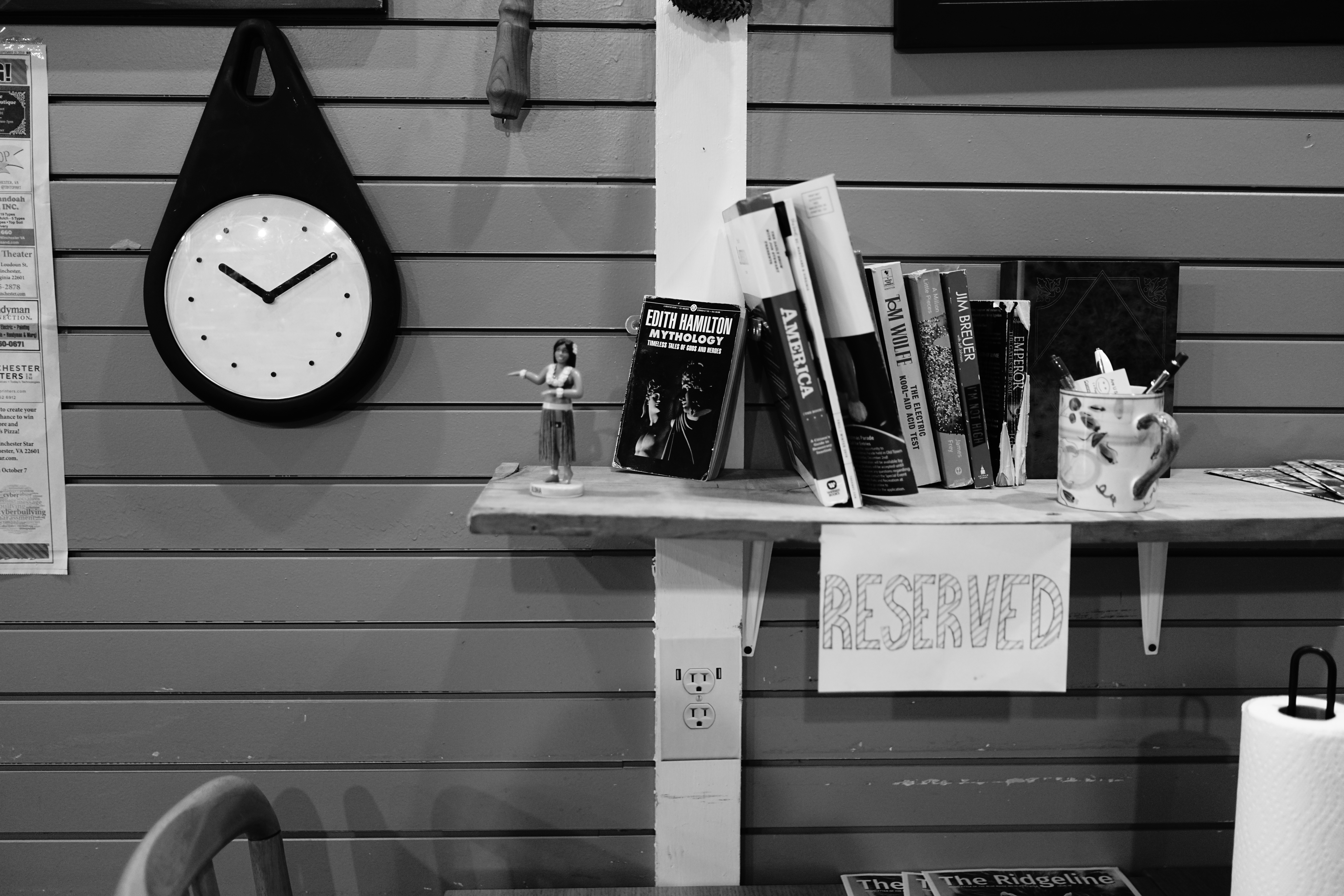 This photograph captures a cozy corner filled with books, a clock, and nostalgic details, offering a glimpse into a serene space. The monochrome palette enhances the mood of calm contemplation, drawing attention to the simple yet charming arrangement of items. Soft lighting casts gentle shadows, inviting the viewer to pause and appreciate the beauty in everyday moments.