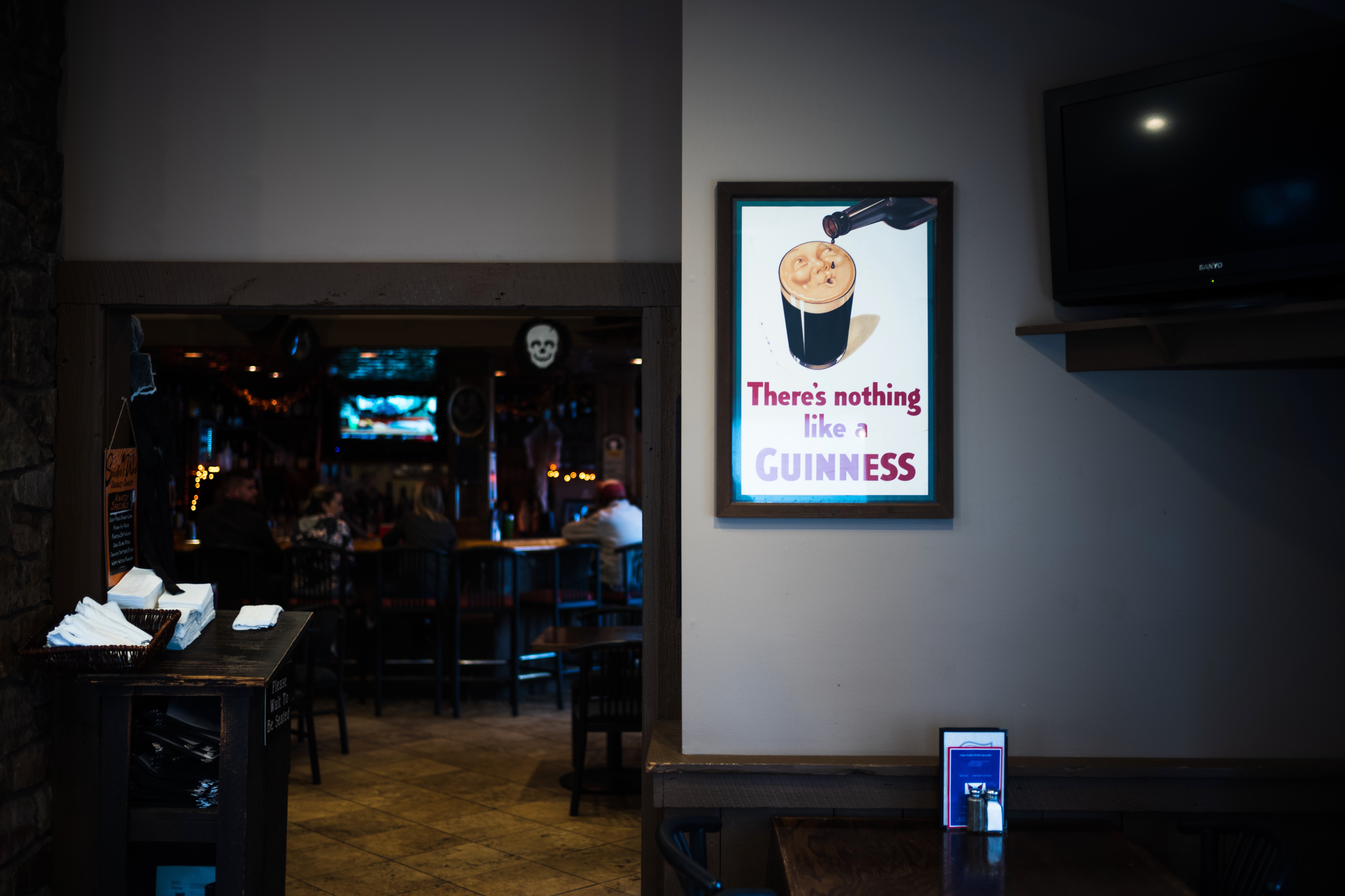 The photograph captures a cozy pub setting, framed by a doorway that leads to a deeper bar area. The prominent Guinness sign, illuminated softly, creates a warm and inviting mood, while the dim lighting suggests a laid-back atmosphere where patrons can enjoy their drinks. Shadows play across the wood surfaces, enhancing the rustic charm and welcoming ambiance of the space.