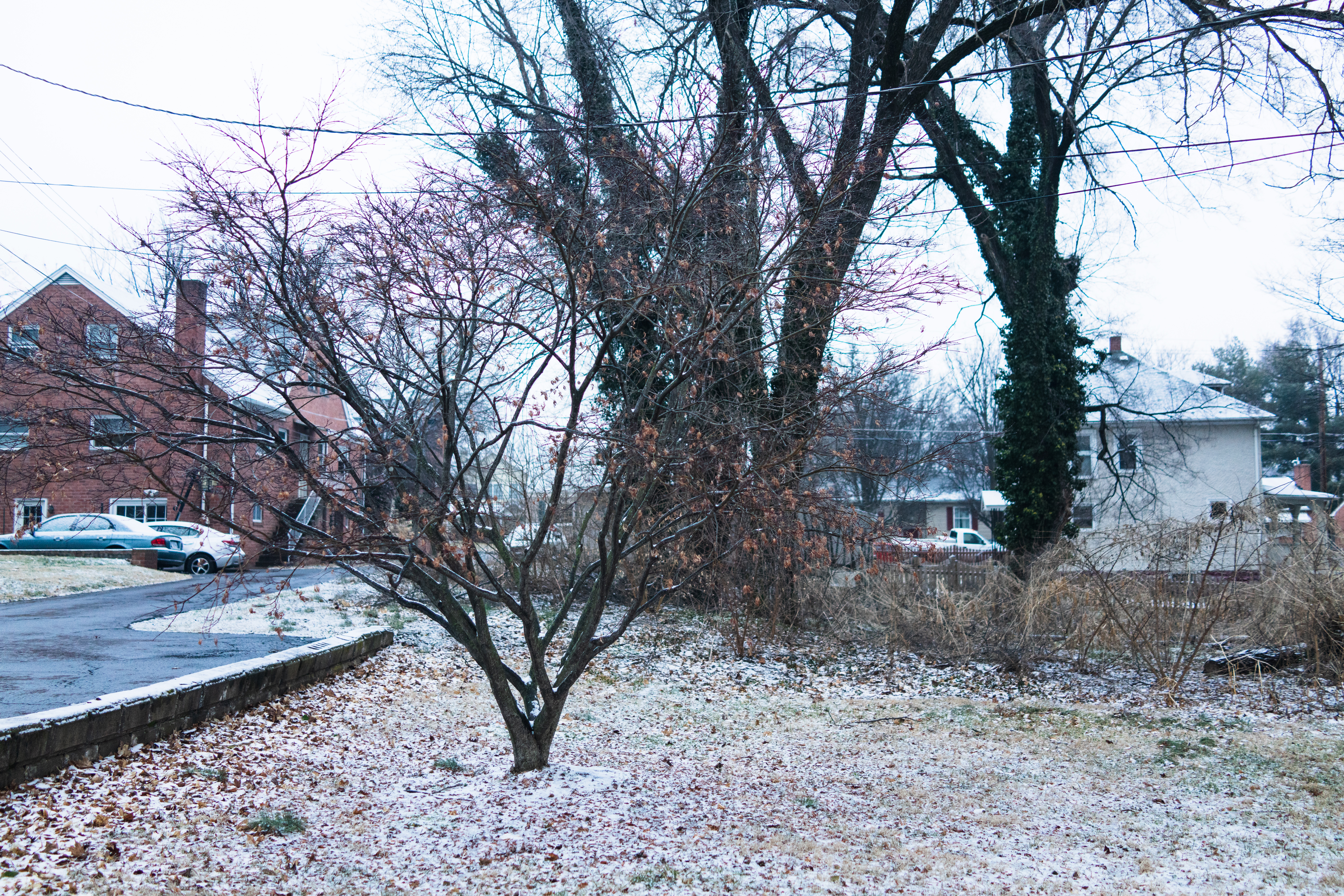 A solitary, leafless tree stands in the foreground, its dark branches stark against a muted, wintry sky. The ground is lightly dusted with snow, enhancing the serene, almost melancholic mood of the scene. Background houses are obscured by the overcast light, creating a sense of calm isolation in the neighborhood.